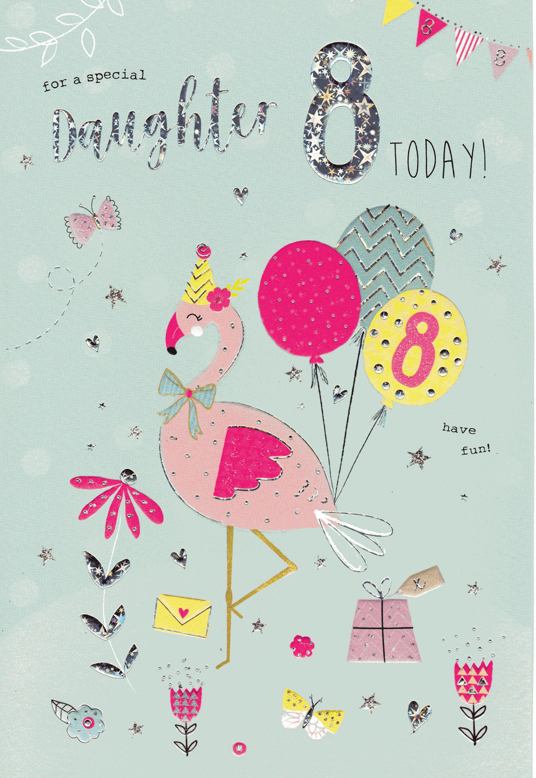 Inside reads: It's so easy to wish a Daughter as wonderful and precious as you, a Birthday that brings happiness in everything you do. Sending lots of love and wishes especially for you. Happy 8th Birthday To a Wonderful Daughter.