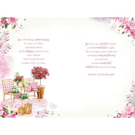 Inside reads: Your Wedding Anniversary is a time to reflect and think about all the happy moments you have shared and to look forward to many more to come, You two are a perfect match, a truly wonderful couple, This message comes with love and many congratulations to you both on this wonderful celebration of your marriage. Happy Anniversary