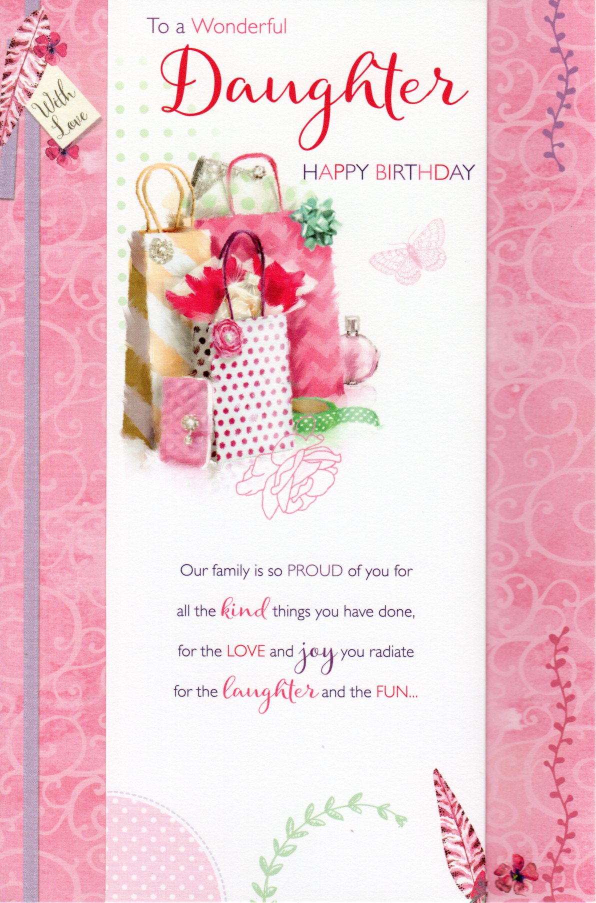 On the front the card reads: To a Wonderful Daughter HAPPY BIRTHDAY.. Our family is so proud of you for all the kind things you have done, for the LOVE and Joy you radiate for the Laughter and the FUN...
