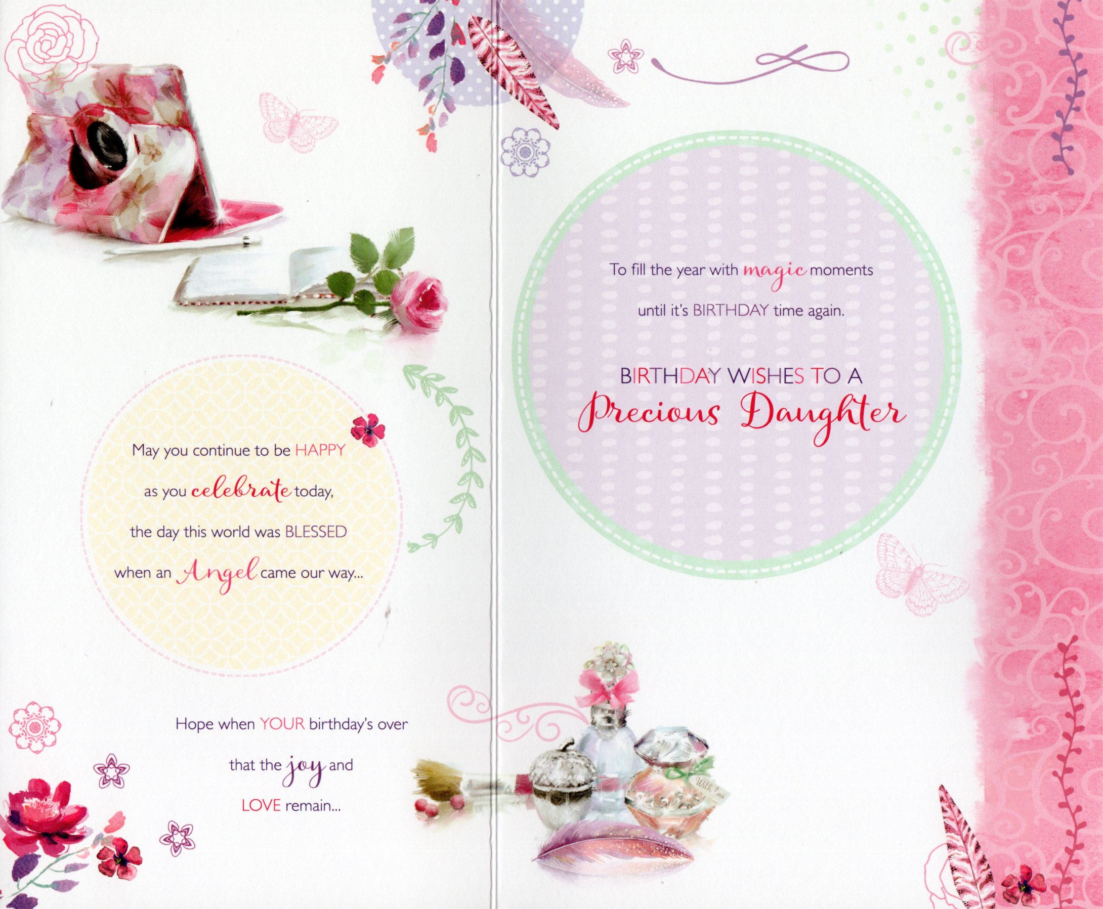 Inside reads: May you continue to be Happy as you celebrate today, the day this world was BLESSED when as Angel come our way... Hope when Hour Birthday's over that the Joy and Love remain. To fill the year with magic moments until it's BIRTHDAY time again. BIRTHDAY WISHES TO A Precious Daughter.