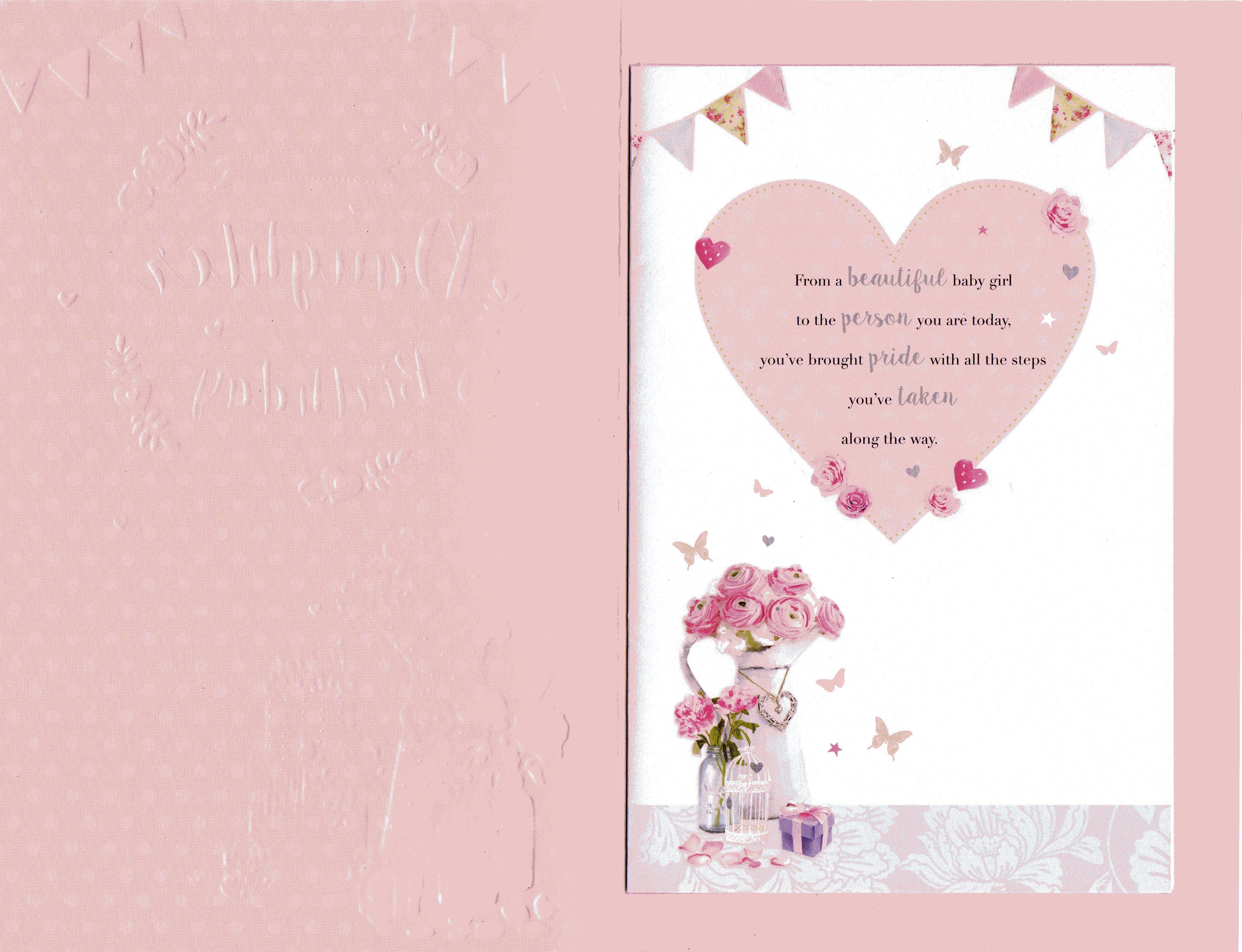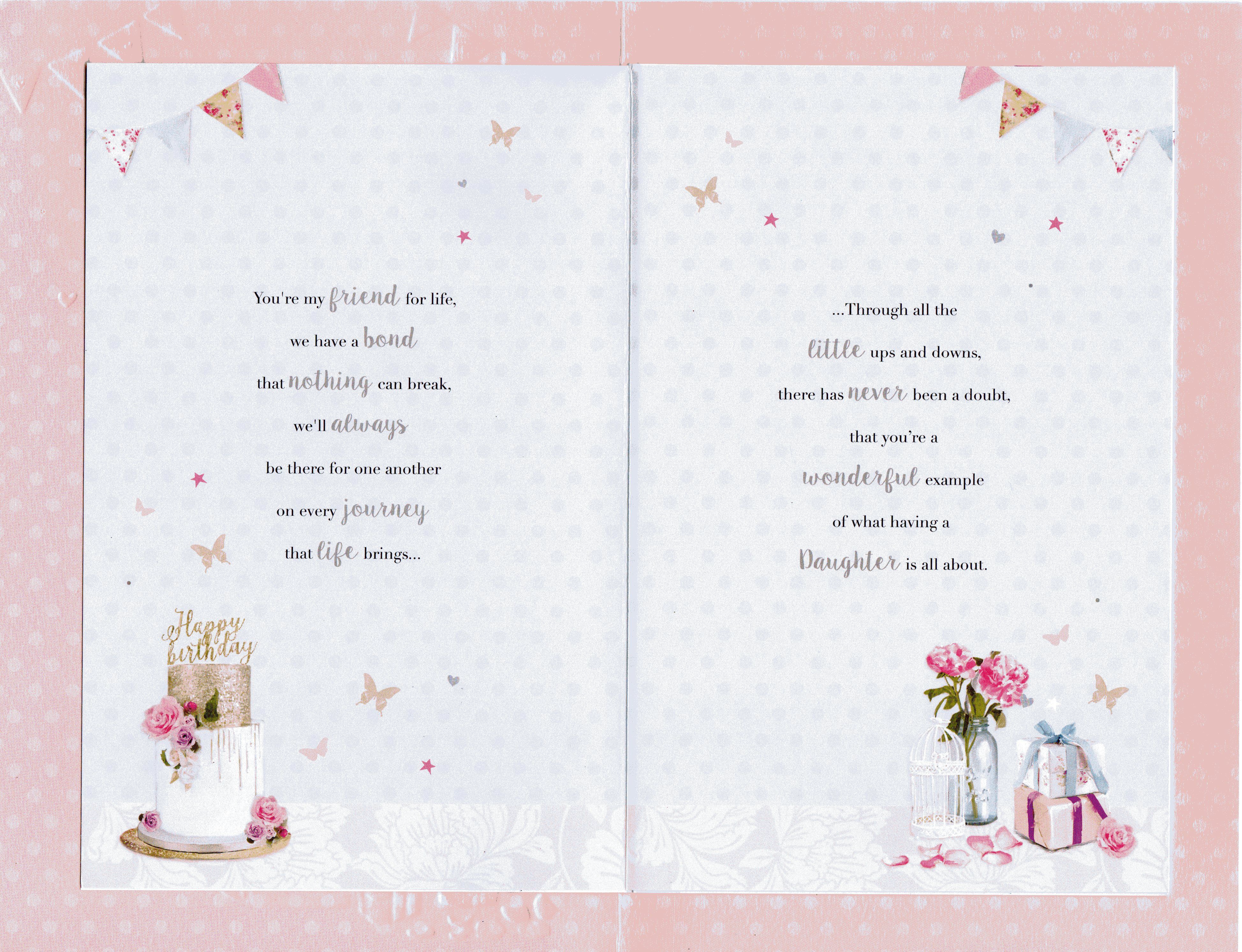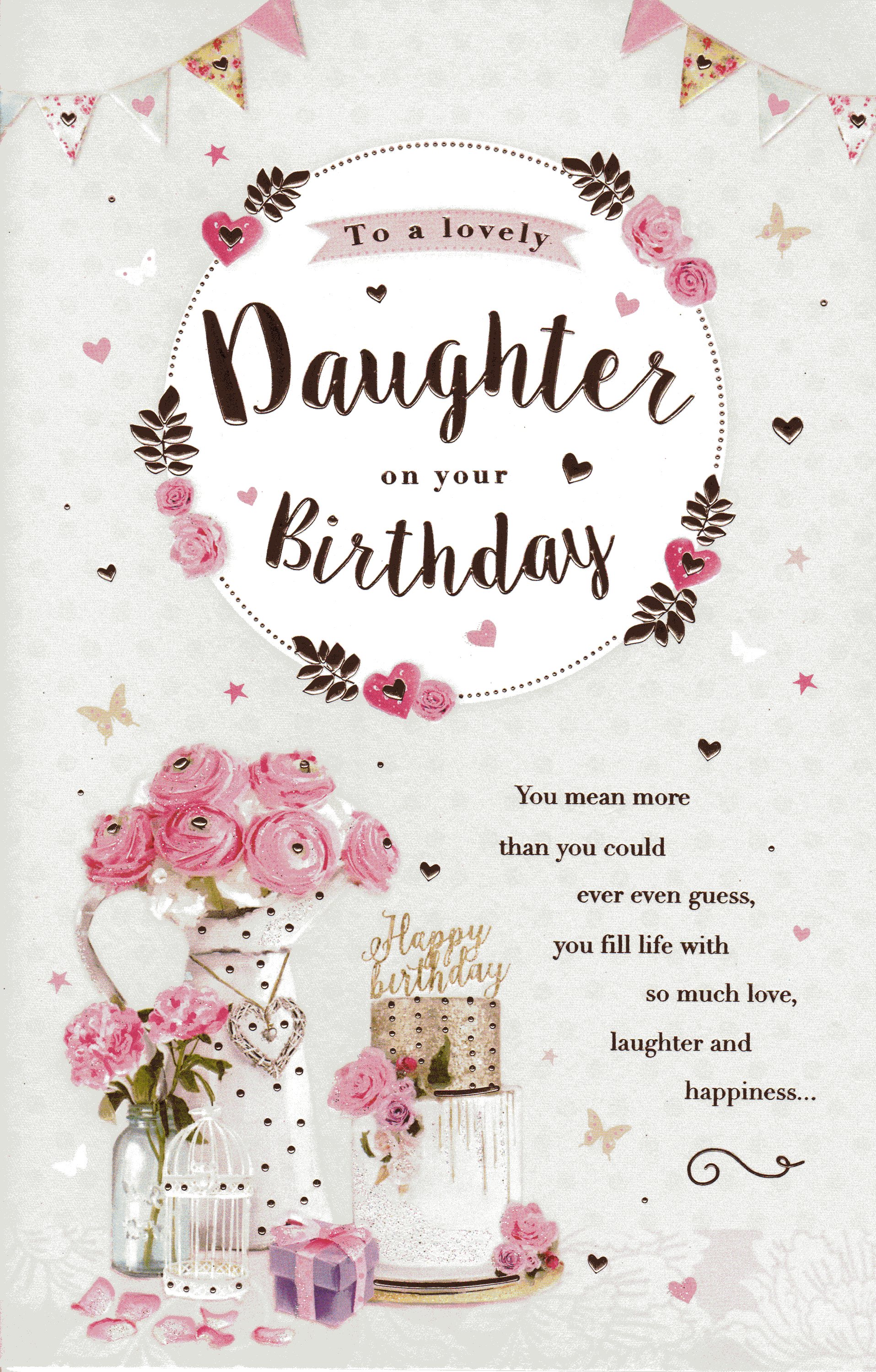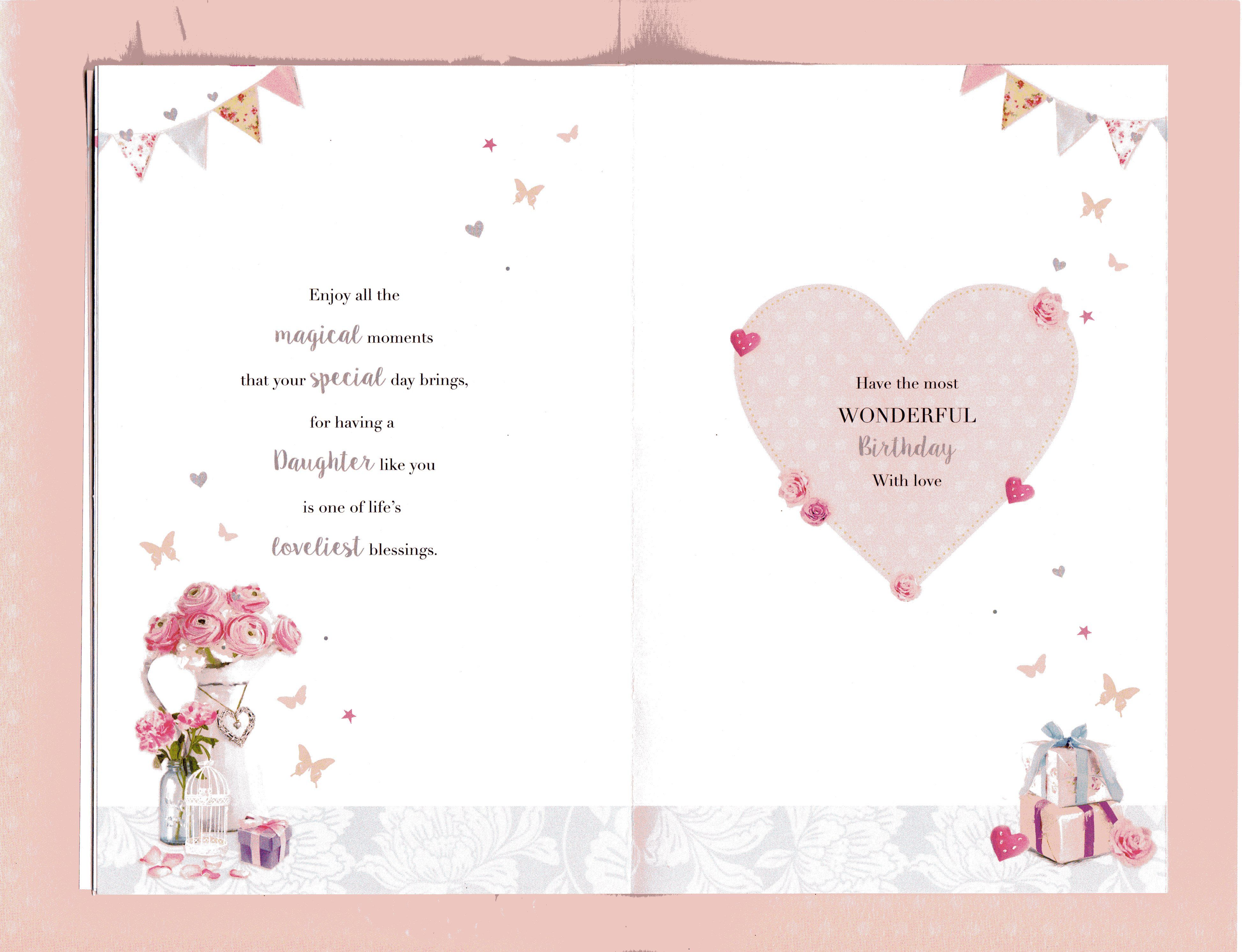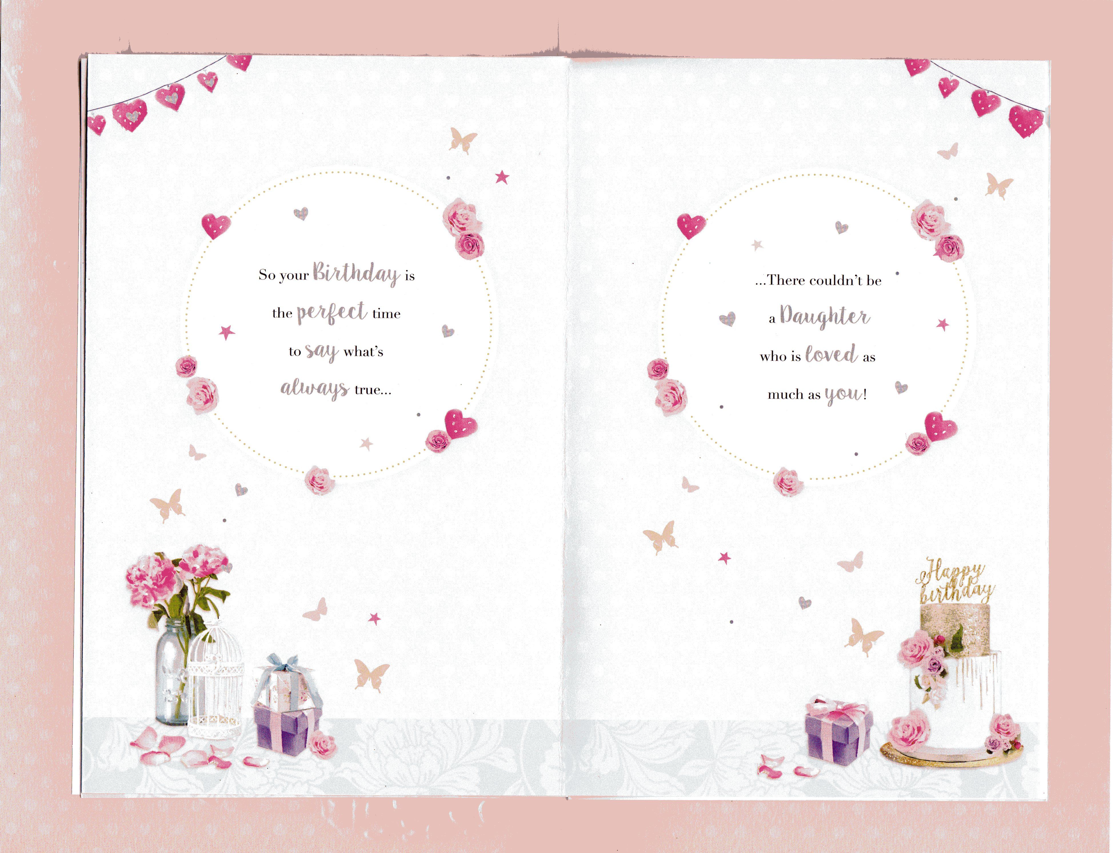 On the front the card reads: To a Lovely Daughter on your Birthday.. You mean more than you could ever even guess, you fill life with so much love, laughter and happiness..