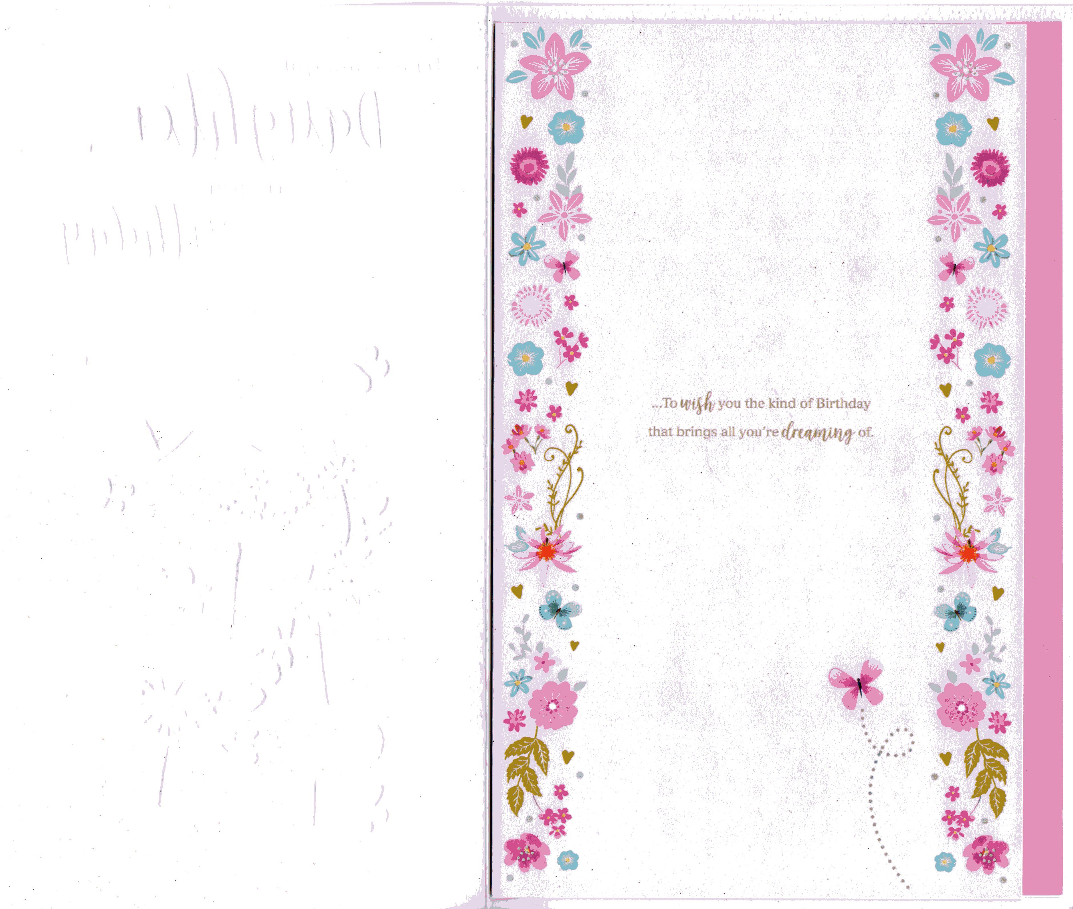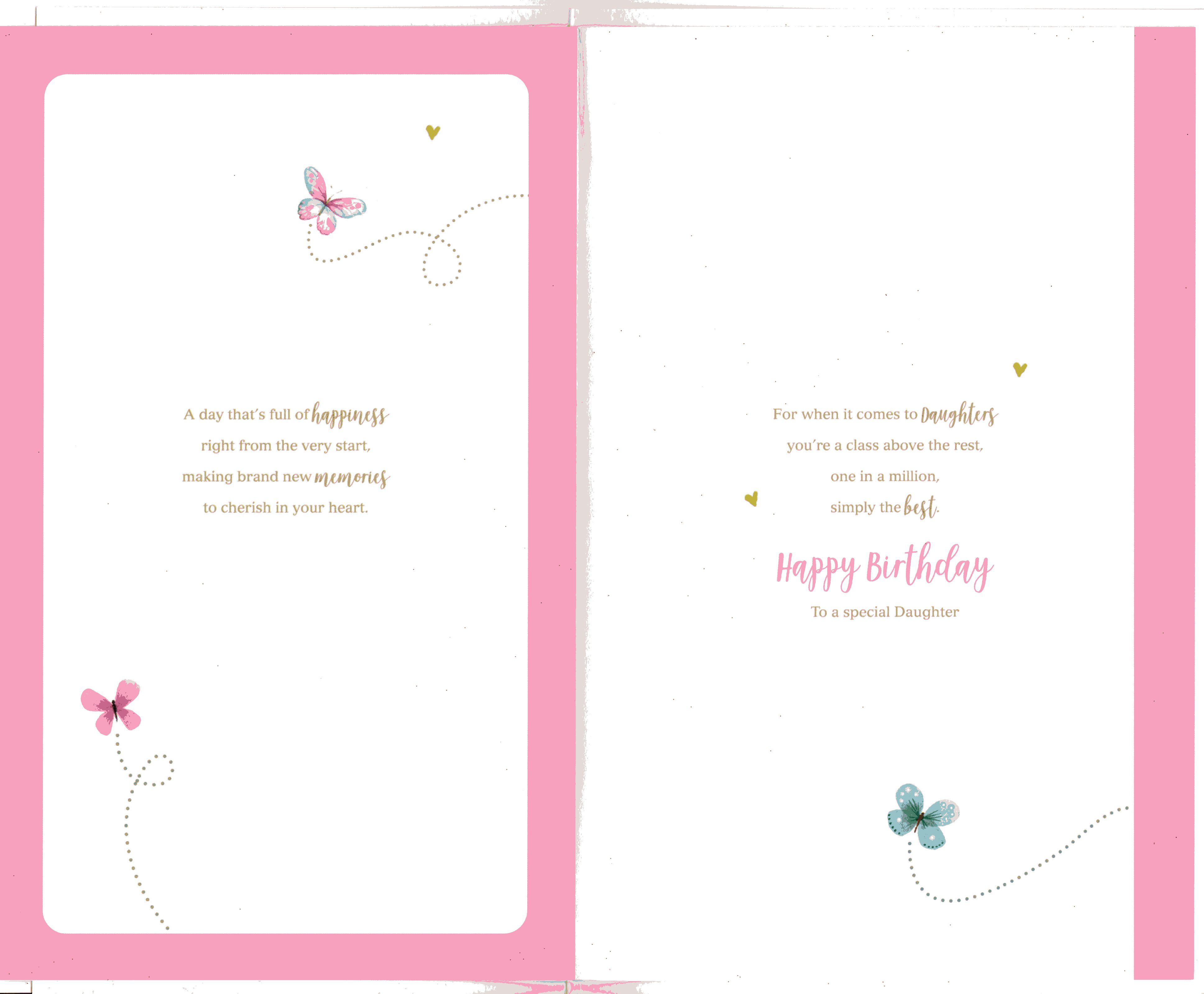 Inside reads: Page I: ...To wish you the kind of Birthday that brings all you're dreaming of. Page II: A day that's full of happiness right from the very start, making brand new memories to cherish in your heart. Page III: For when it comes to Daughter you're a class above the rest, one in a million, simply the best. Happy Birthday To a Special Daughter.