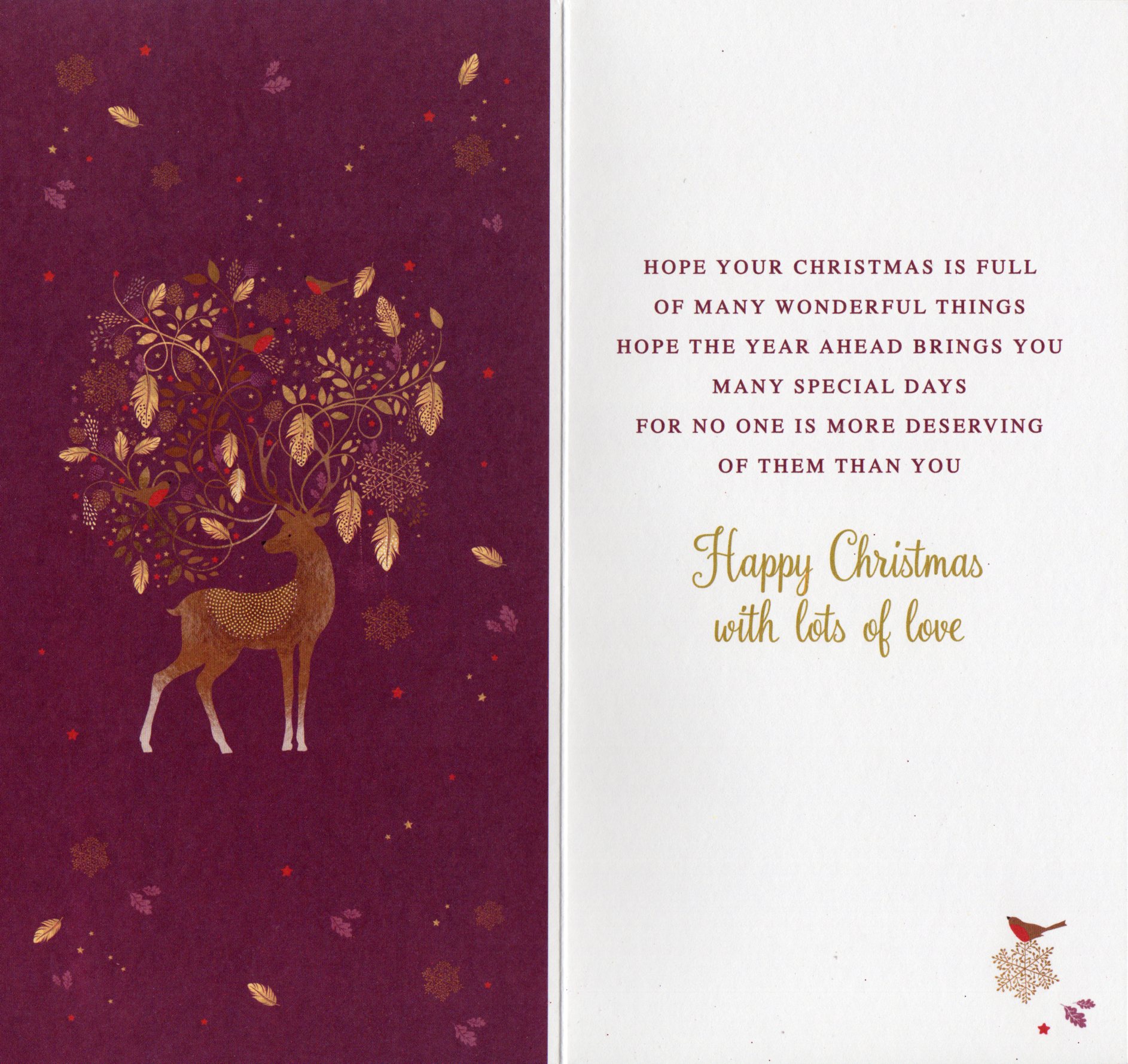 Inside reads: Hope your Christmas is full of many wonderful things hope the year ahead brings you many special days for no one is more deserving of them then you Happy Christmas with lots of love