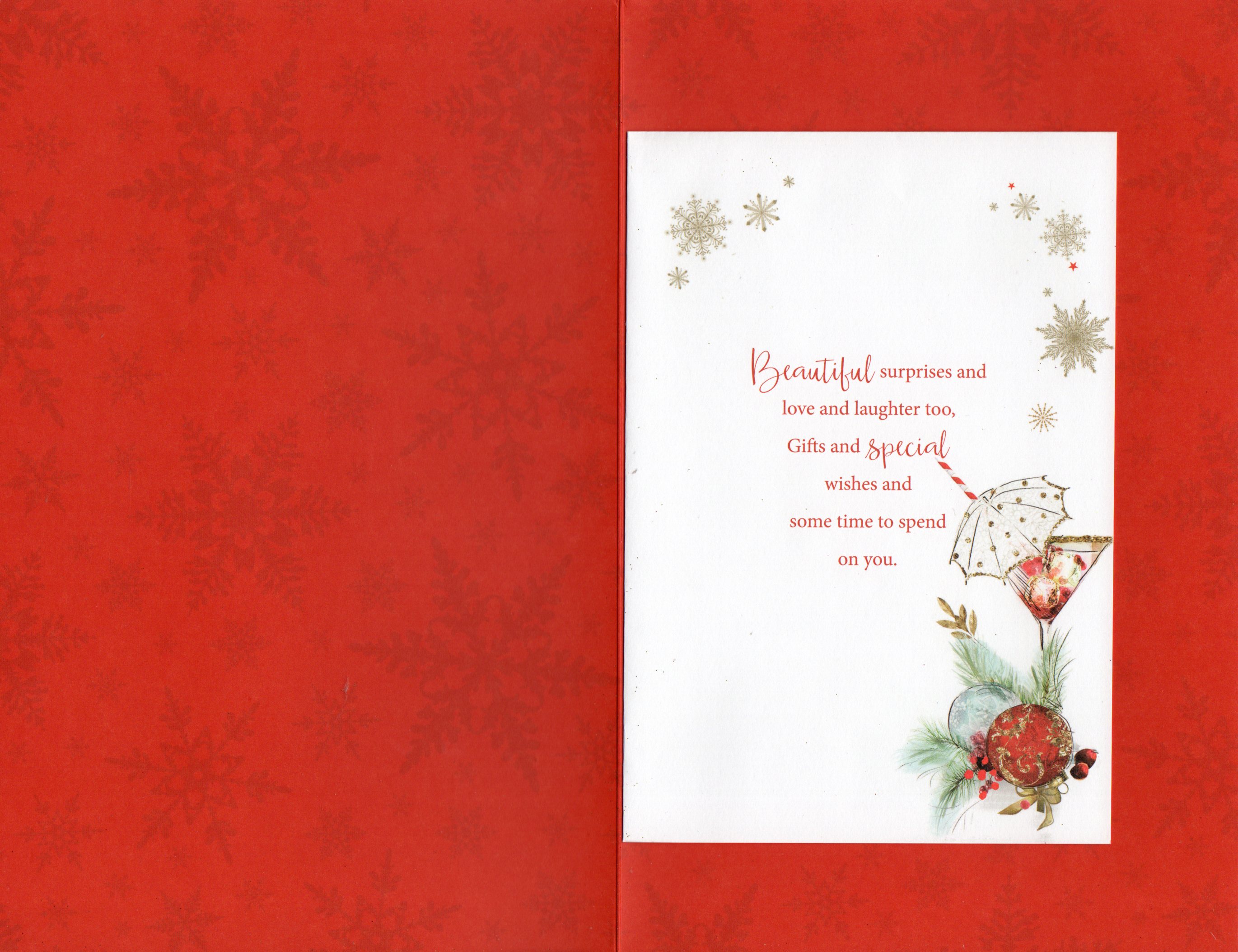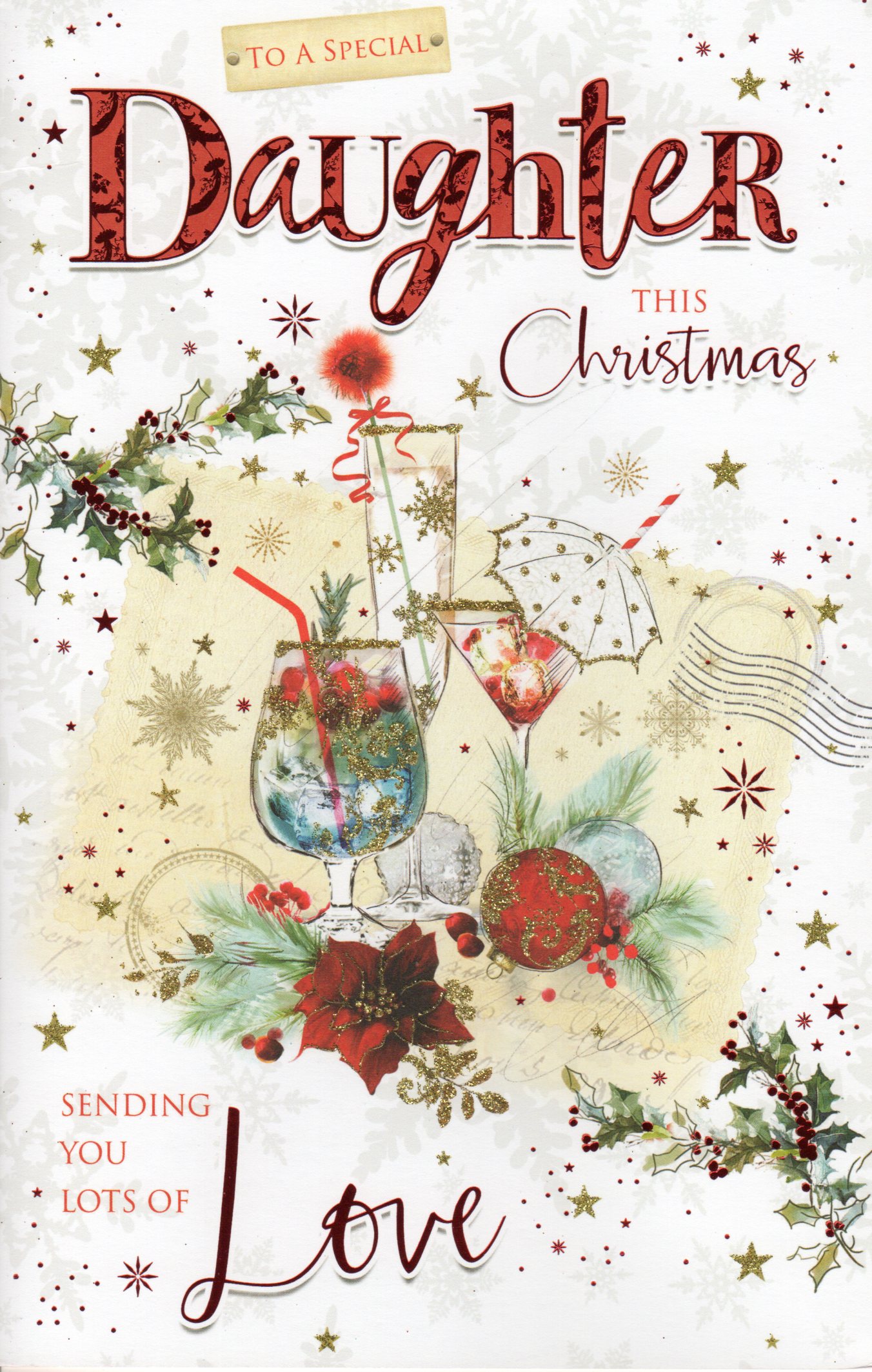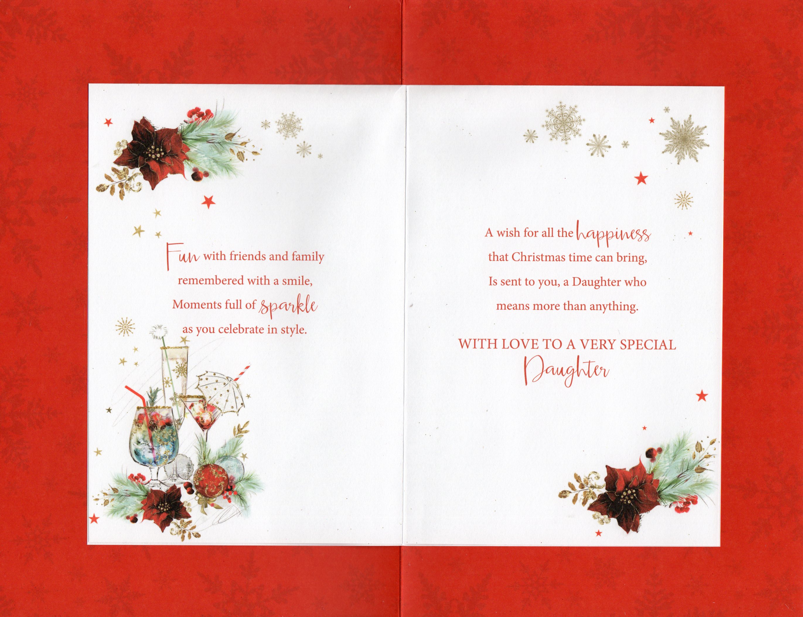 Inside reads: page l Beautiful surprise and love and laughter too, Gifts and Special wishes and some time to spend on you. page ll Fun with friends and family remembered with a smile, Moments full of sparkle as you celebrate in style. page lll A wish for all the happiness that Christmas time can bring, Is sent to you, a Daughter who means more than anything. WITH LOVE TO A VERY SPECIAL DAUGHTER