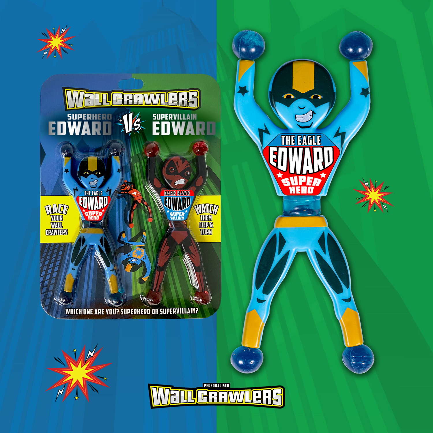 Throw your superhero and supervillain Wall Crawlers at a smooth vertical surface- try a wall, window or even bathroom tiles and see a super race in action!