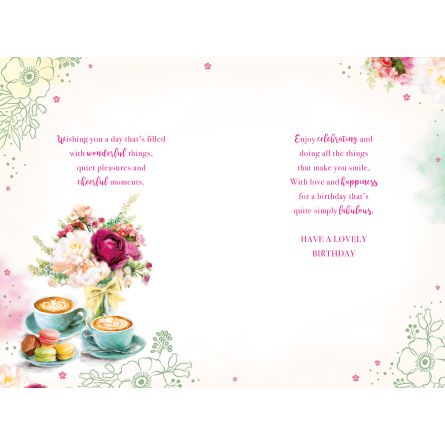 Inside reads: Wishing you a day that's filled with wonderful things, quiet pleasure and cheerful moments. Enjoy celebrating and doing all the things that make you smile, With love and happiness for a birthday that's quite simply fabulous. Have A lovely Birthday
