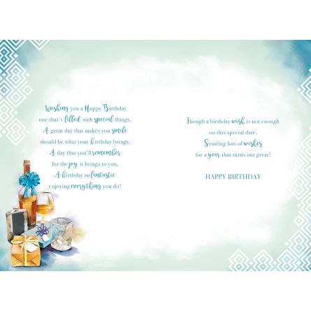 Inside reads: Wishing you a Happy Birthday one that's filled with special things, A great day that makes you smile should be what your birthday brings, A day that you'll remember for the joy it bring to you, A birthday so fantastic enjoying everything you do! Though a birthday wish is not enough on this special date, Sending lots of wishes for a year that turns out great! Happy Birthday