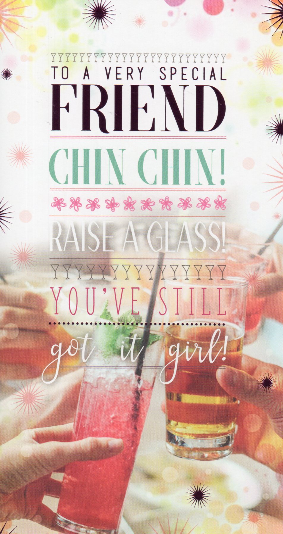 In the front the card reads: To A Very Special Friend Chin Chin! Raise A Glass! You've Still got it girl!