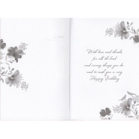 Inside reads: With love and thanks for all the kind and caring things you do, and to wish you a very Happy Birthday