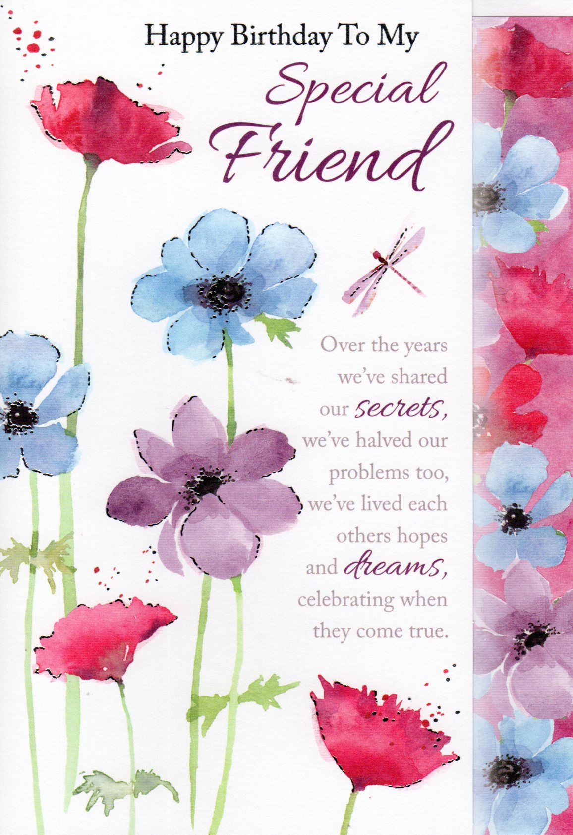 On the front the card reads: Happy Birthday To My Special Friend Over the years we've shared our secrets, we've halved our problems too, we've lived each other hopes and dreams, celebrating when they come true.