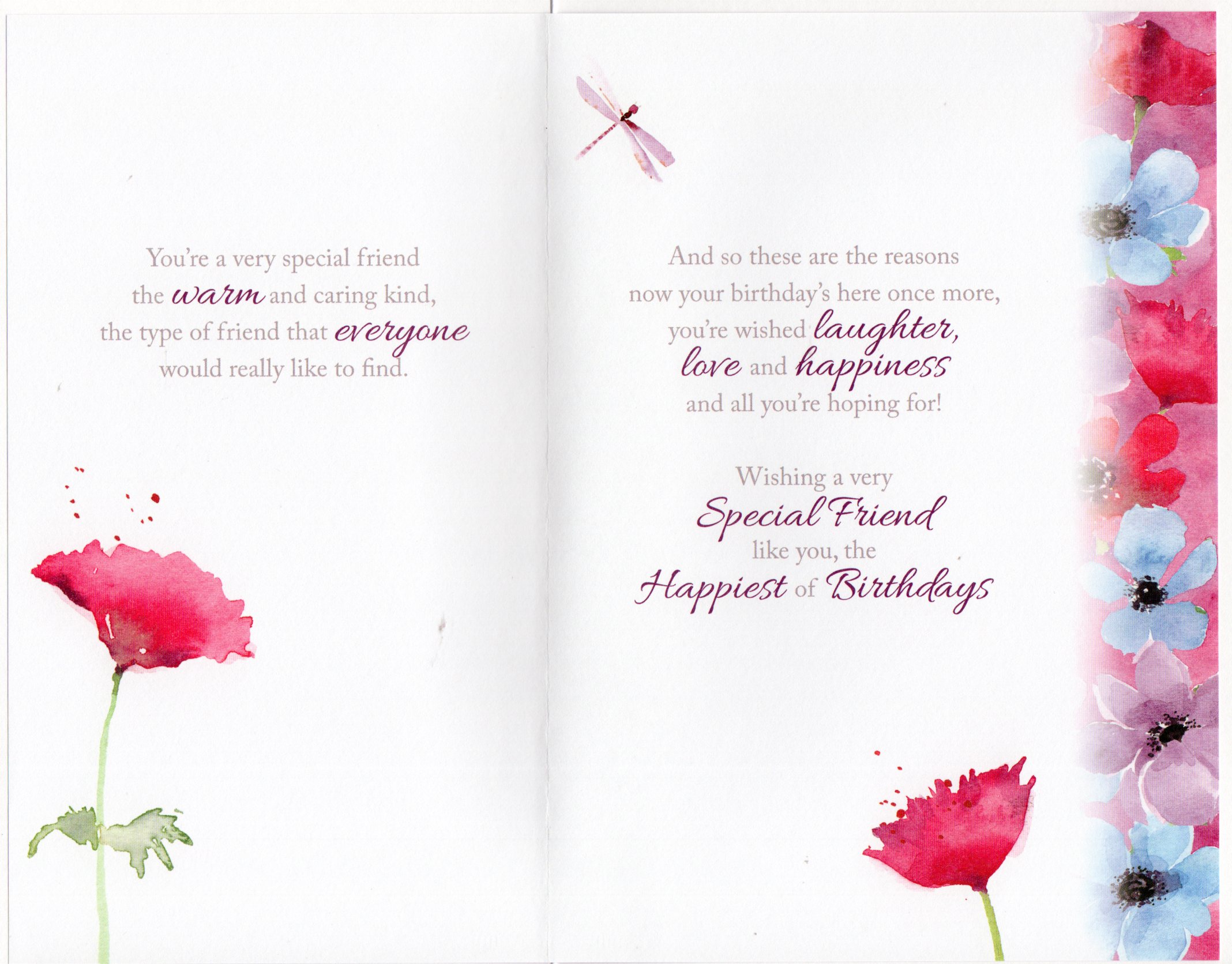 Inside reads: You're very special friend the warm and caring kind, the type of friend that everyone would really like to find. And so these are the reasons now your birthday's here once more, you're wished laughter, love and happiness and you're hoping for! Wishing a very Special Friend like you, the Happiest of Birthdays