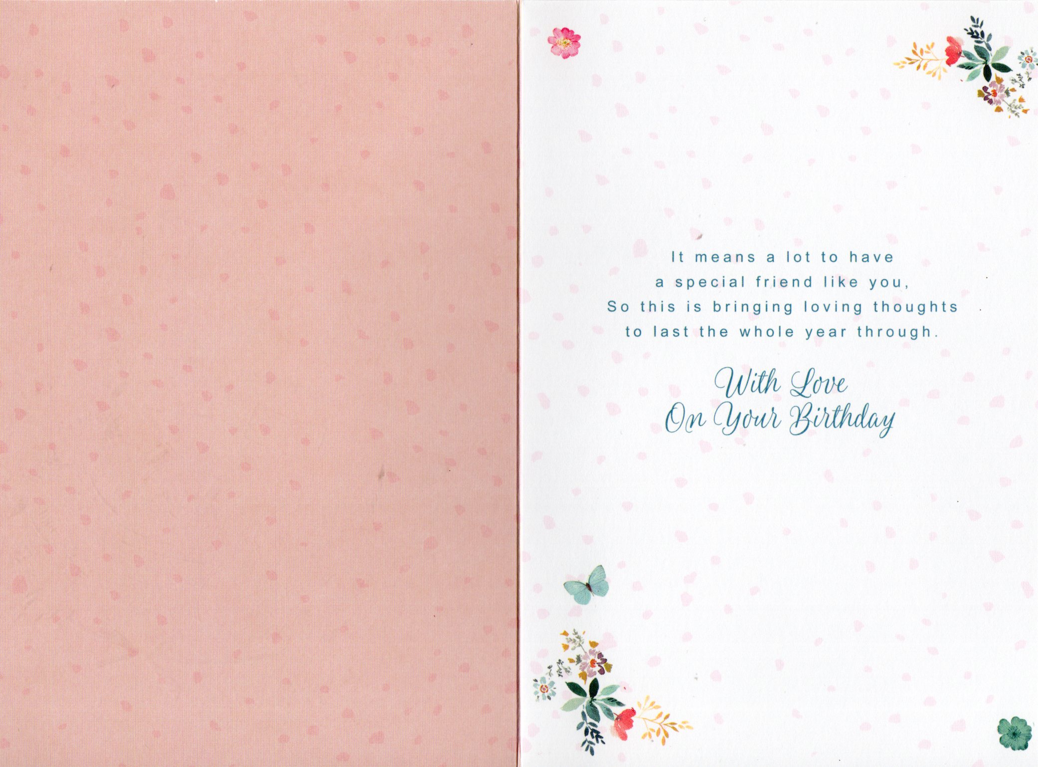 Inside reads: It means a lot to have a special friend like you, So this is bringing loving thoughts to last the whole year through. With Love On Your Birthday