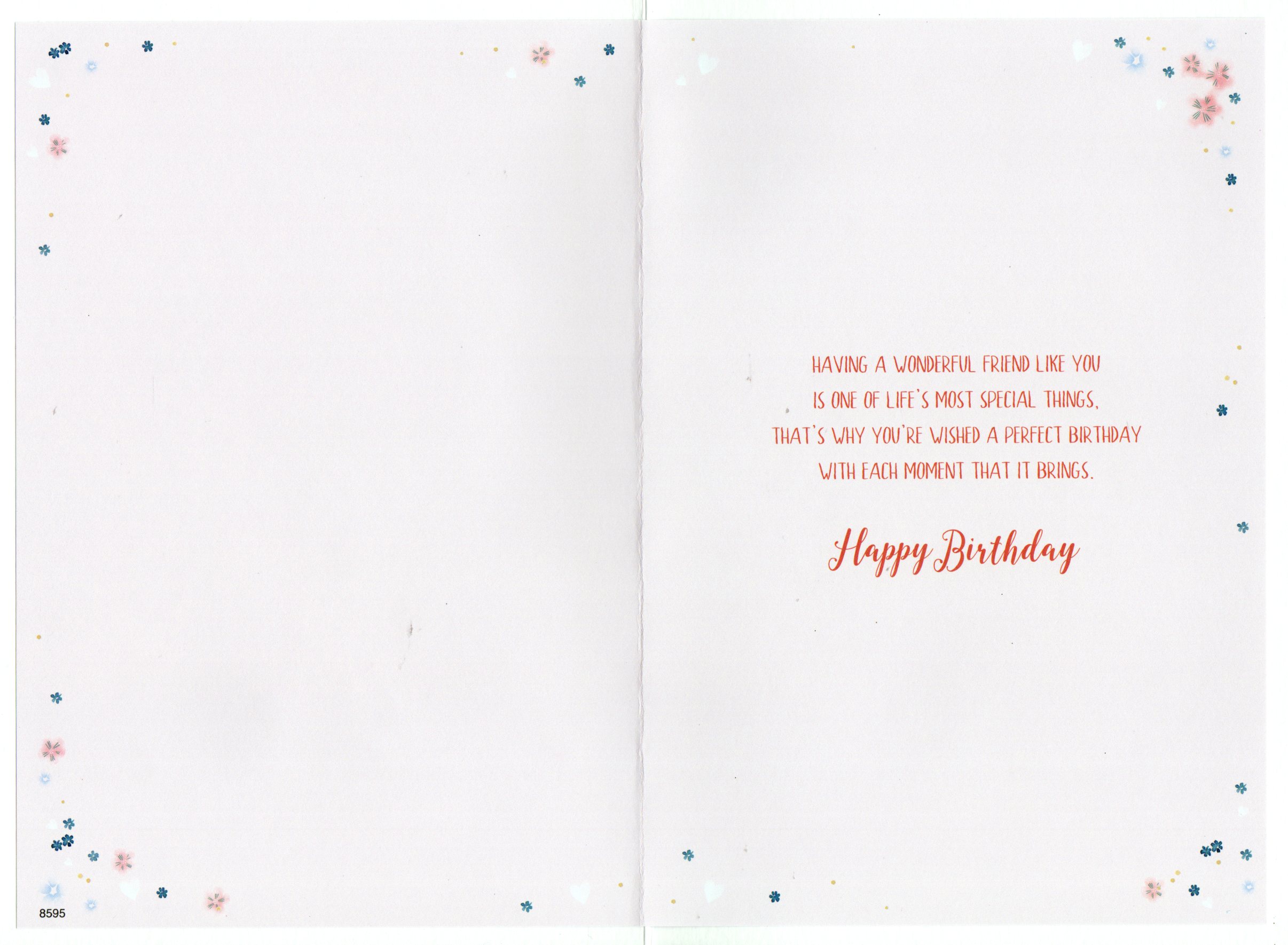 Inside reads: Having A wonderful friend like you is one of life's most special things, that's why you're wished A perfect Birthday with each moment that it brings. Happy Birthday