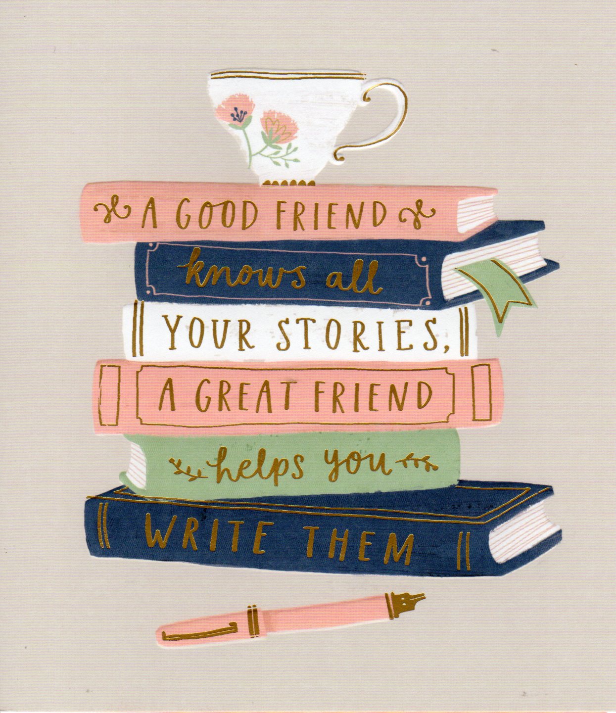On the front the card reads: A Good Friend Know All Your Stories, A Great Friend Helps You Write Them