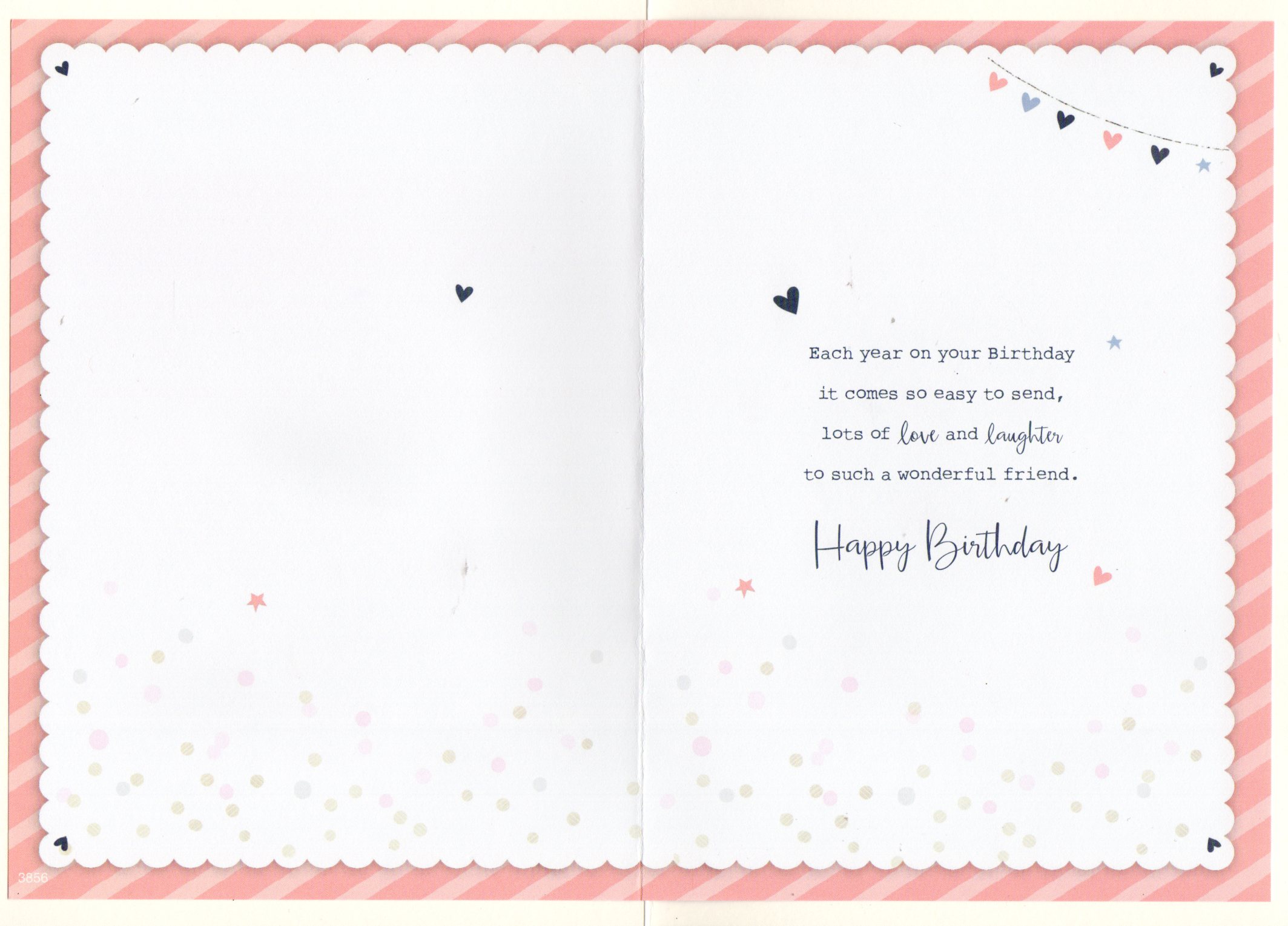 Inside reads: Each year on your Birthday it comes so easy to send, lots of love and laughter to such a wonderful friend. Happy Birthday