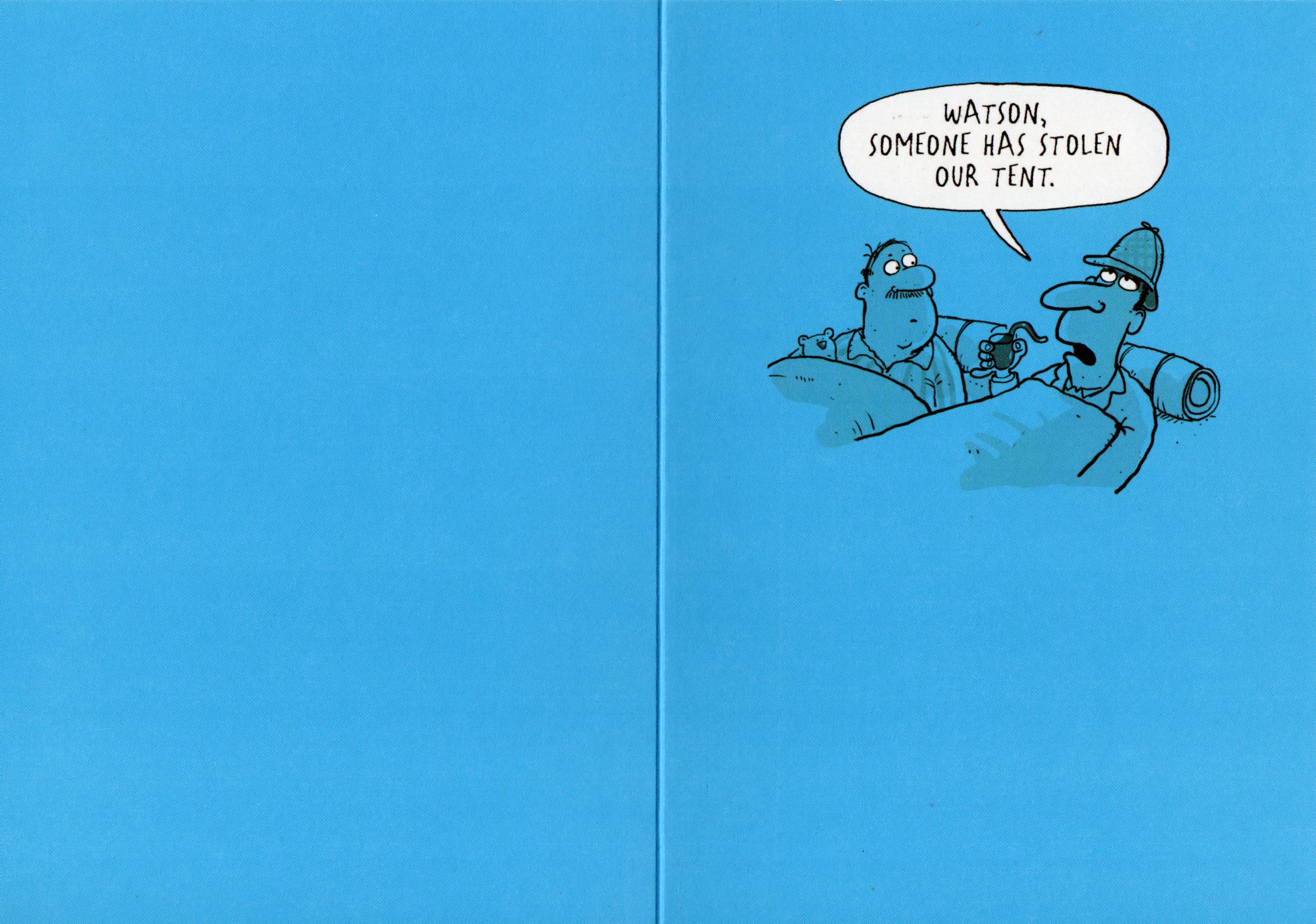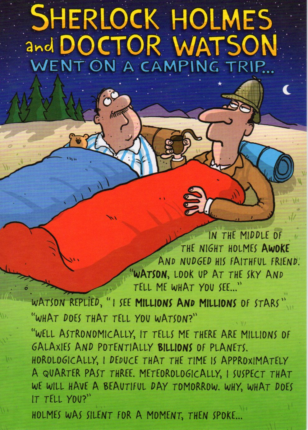 On the front the card reads: Sherlock Holmes and Doctor watson went on a camping trip..., in the middle of the night holmes Awoke and nudged his faithful friend.''Watson, look up at the sky and tell me what you see...'' watson replied, ''i see Millions and Millions of stars'' ''what dose that tell you watson?'' ''well astronomically, it tells me there are millions of galaxies and potentially Billions of planets. horologically, i deduce that the time is approximately a quarter past three, meteorologically, i suspect that we will have a beautiful day tomorrow. why, what dose it tell you?'' holmes was silent for a moment, then spoke...