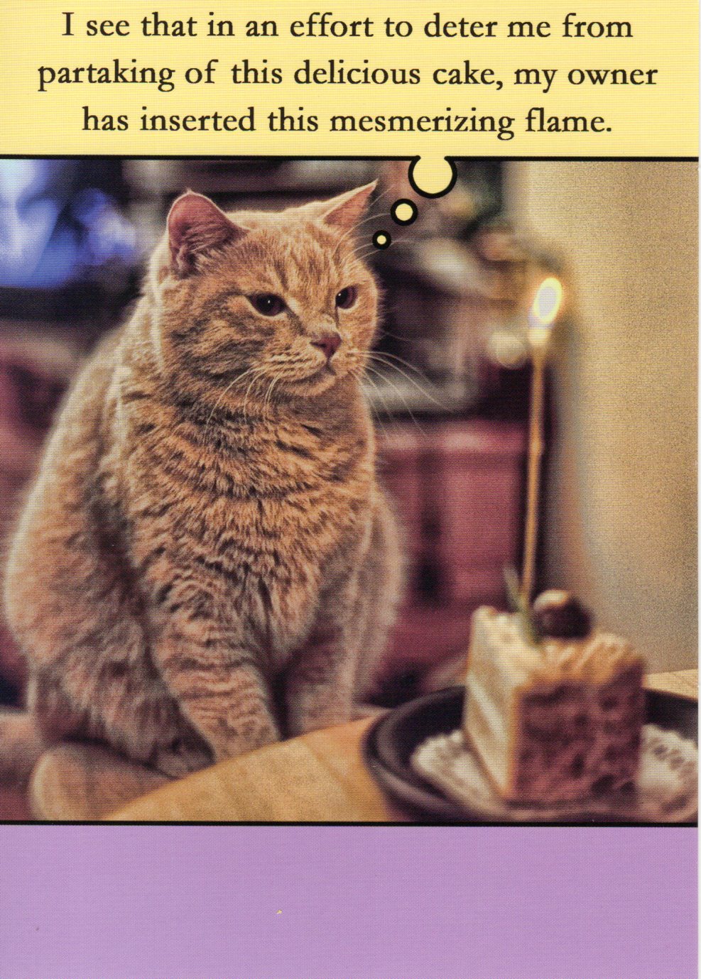 On the front the card reads: I see that in an effort to deter me from partaking of this delicious cake, my owner has inserted this mesmerising flame.