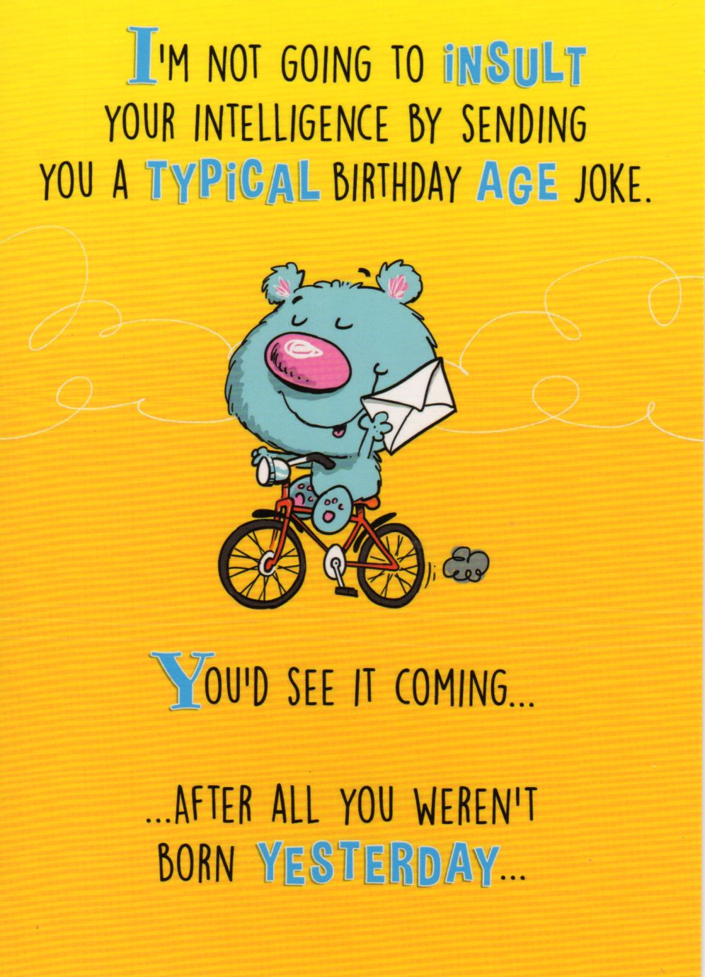 On the front the card reads: I'm Not Going To Insult Your Intelligence By Sending You A Typical Birthday Age Joke. You'd See It Coming..., ...After All You Weren't Born Yesterday...