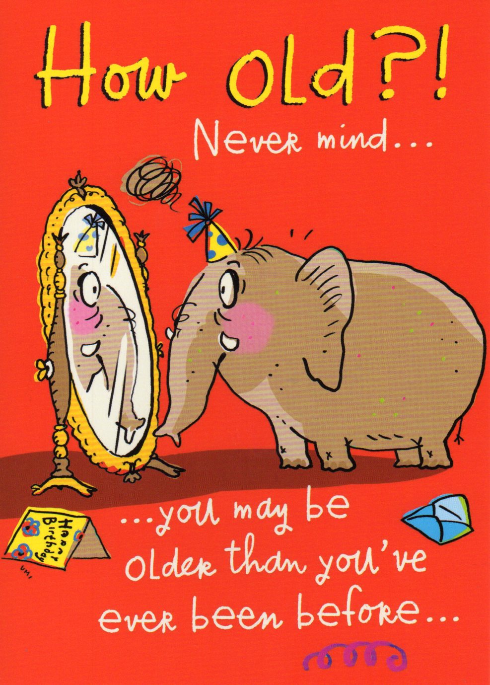 On the front the card reads: How Old?! Never mind..., ...you may be older than you've ever been before...