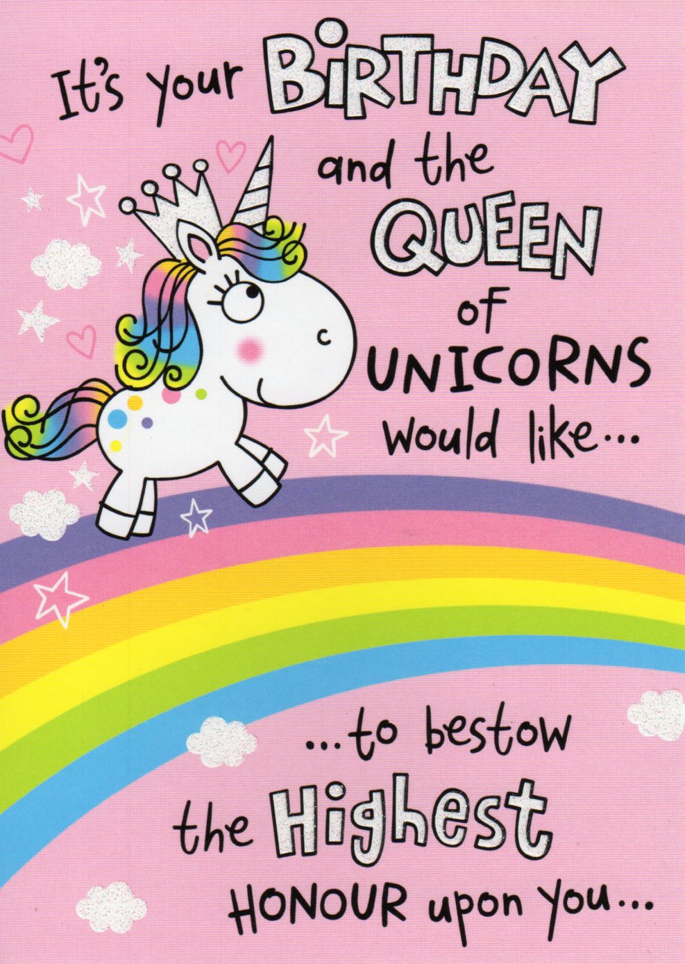 On the front the card reads: It's your Birthday and the Queen of Unicorns would like..., ...to bestow the Highest Honour upon you...