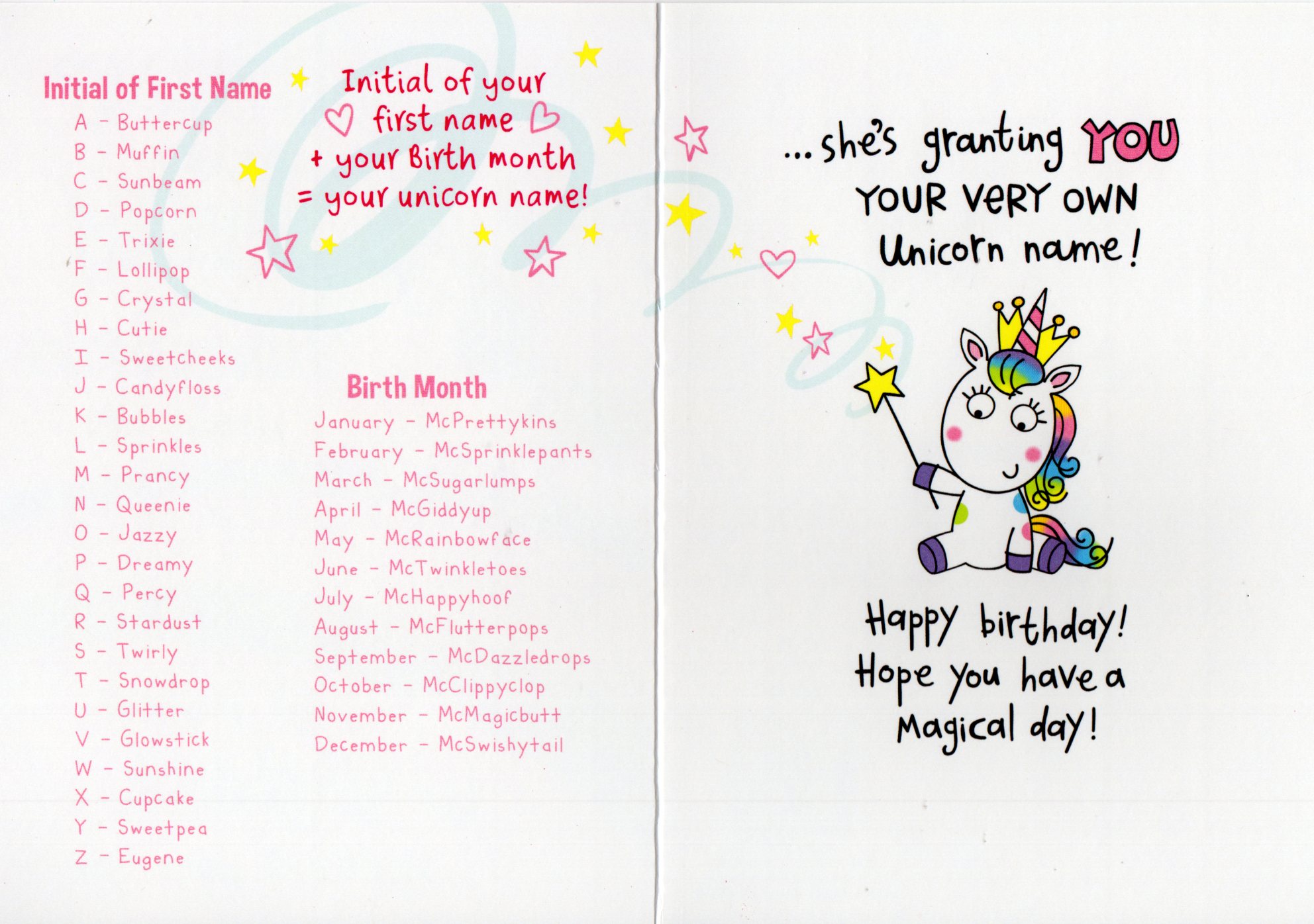 Inside reads: ...she's granting You your very own Unicorn name! Happy birthday! Hope you have a magical day!