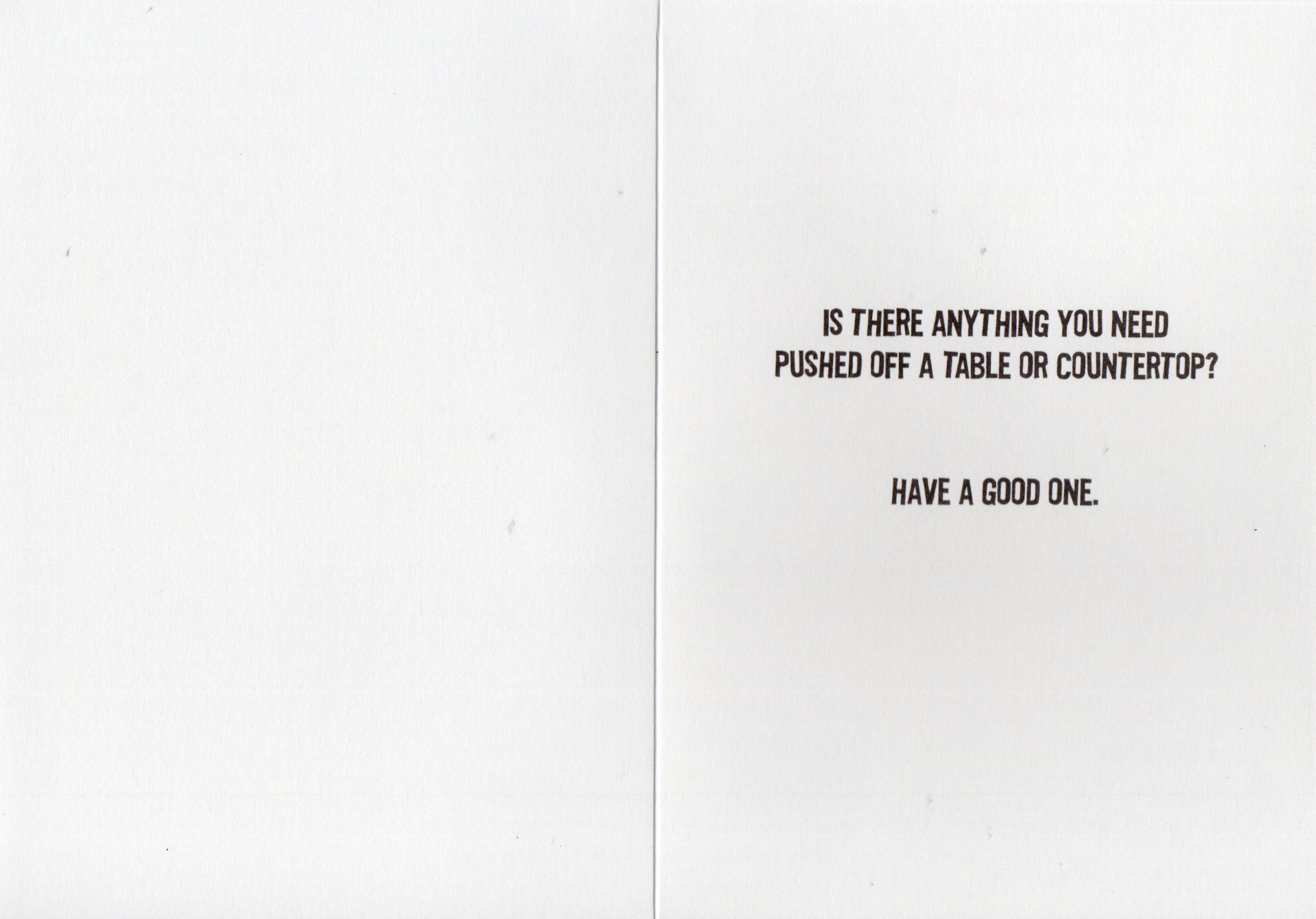Inside reads: Is there anything you need pushed off A table or countertop? Have A Good One.
