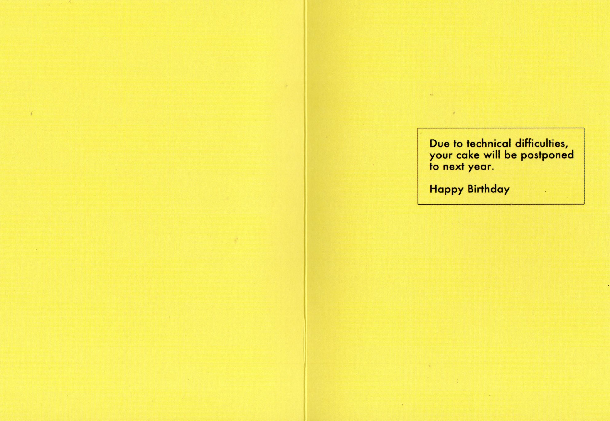 Inside reads: Due to technical difficulties, your cake will be postponed to next year. Happy Birthday