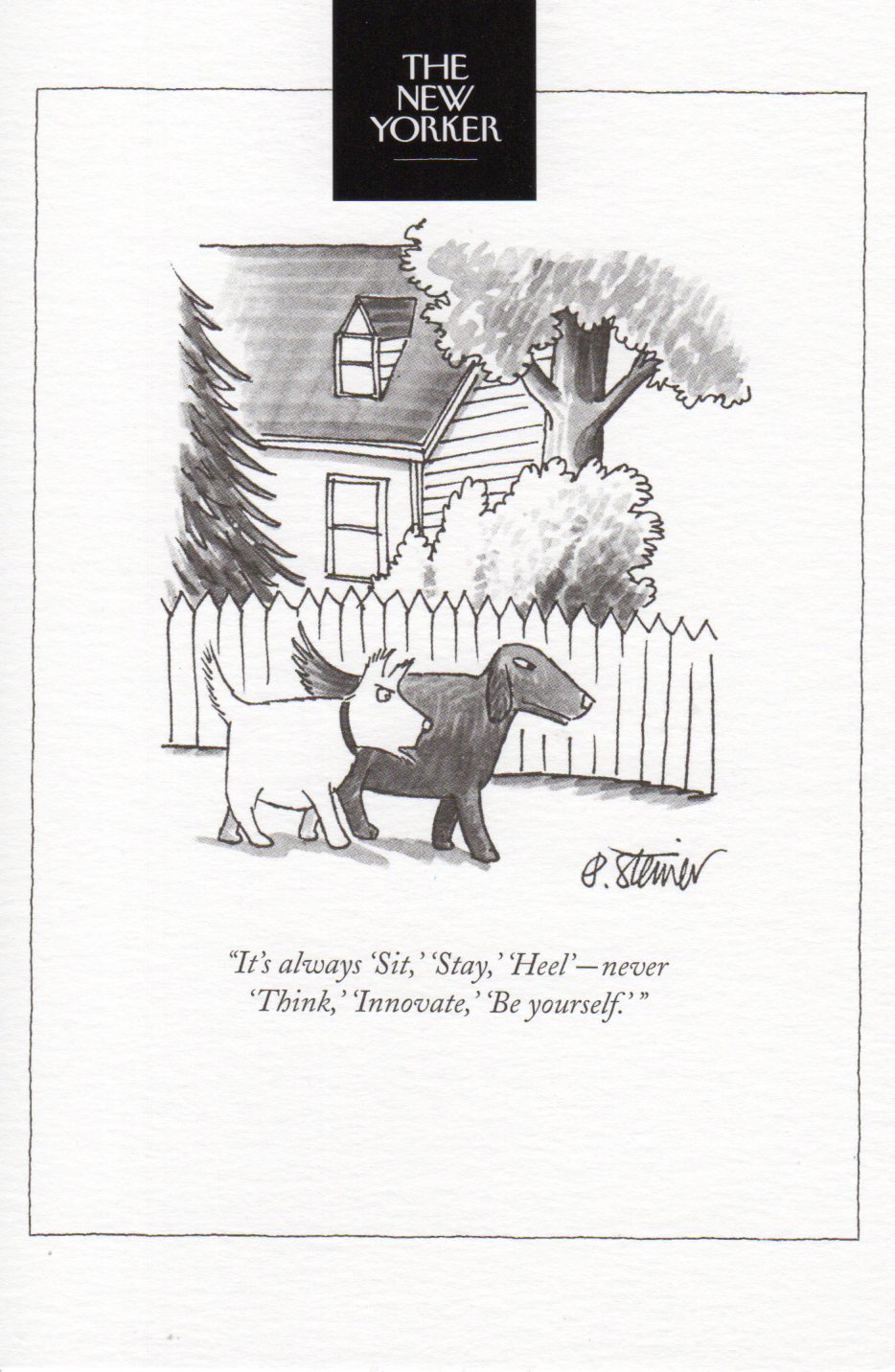 On the front the card reads: "It's always 'Sit,' 'Stay,' 'Heei' - never 'Think,' 'Innovate,' 'Be yourself.' "
