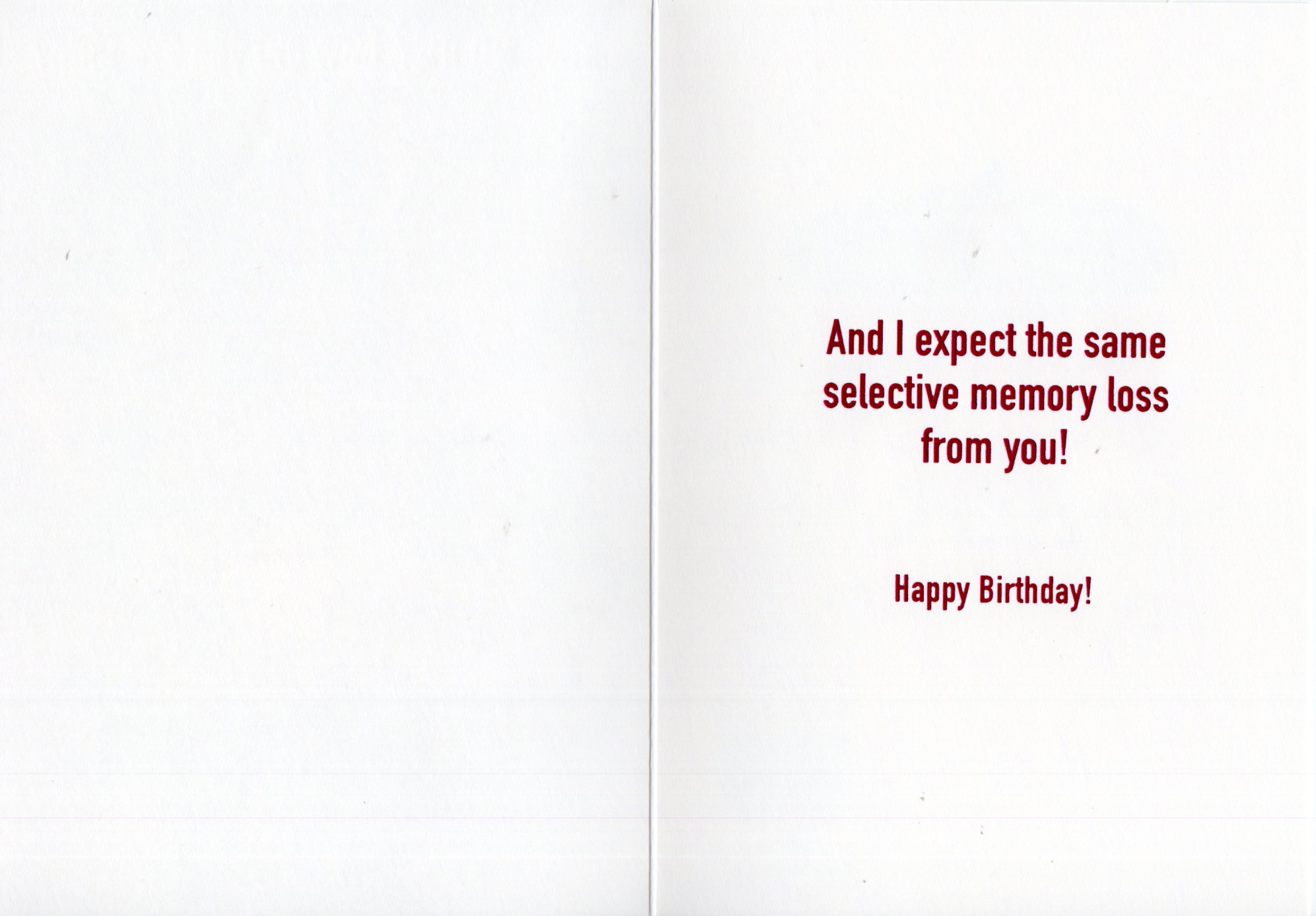 Inside reads: And I expect the same selective memory loss from you! Happy Birthday!