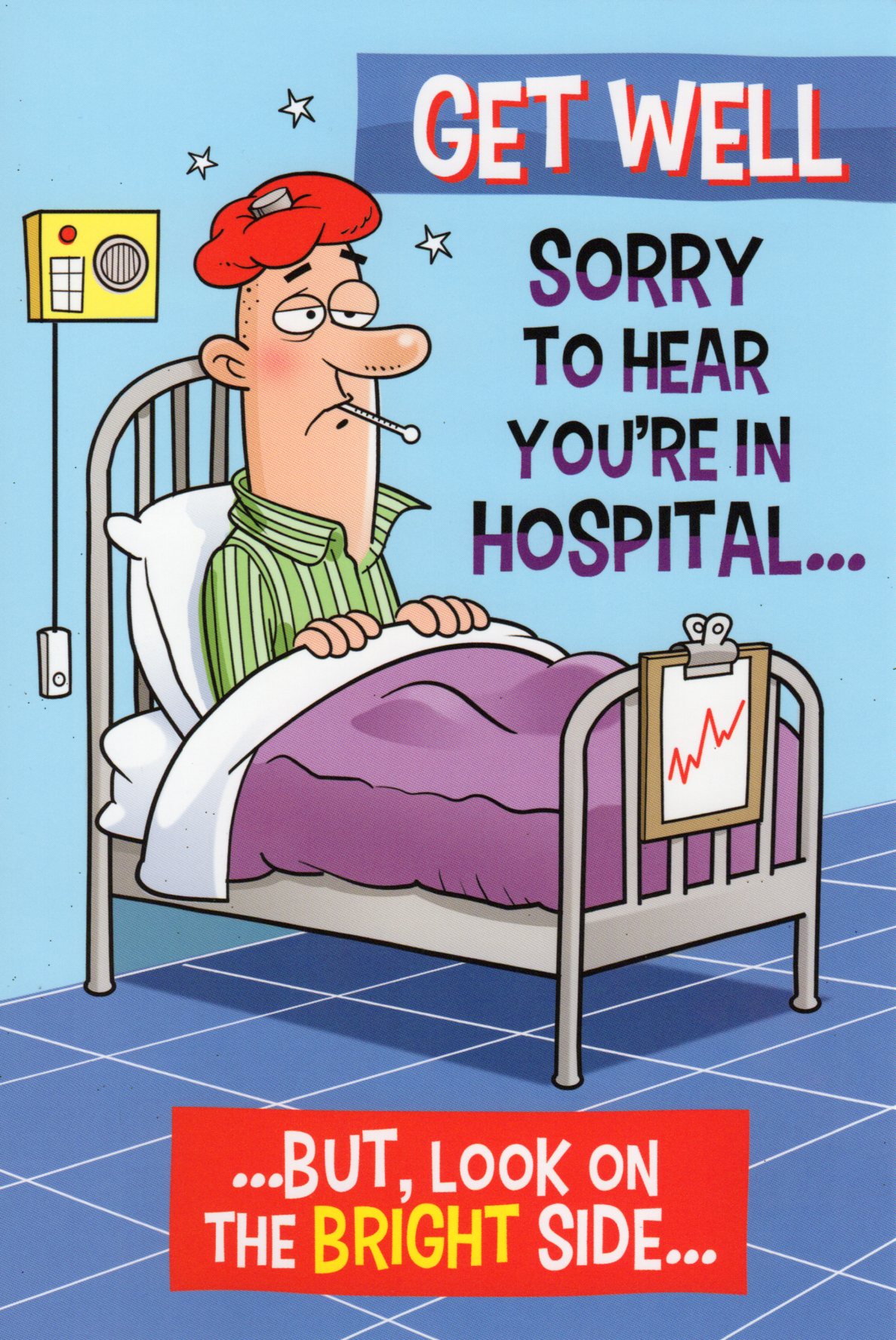 On the front the card reads: Get Well sorry to hear you're in Hospital..., ...But, look on the Bright Side...