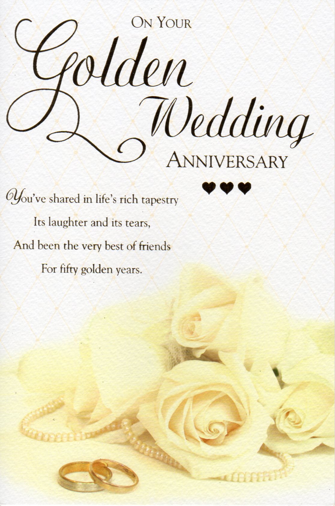 On the front the card reads: On your Golden Wedding Anniversary. You've shared in Life's rich tapestry Its Laughter and its tears, And been the very best of Friends For fifty golden years.