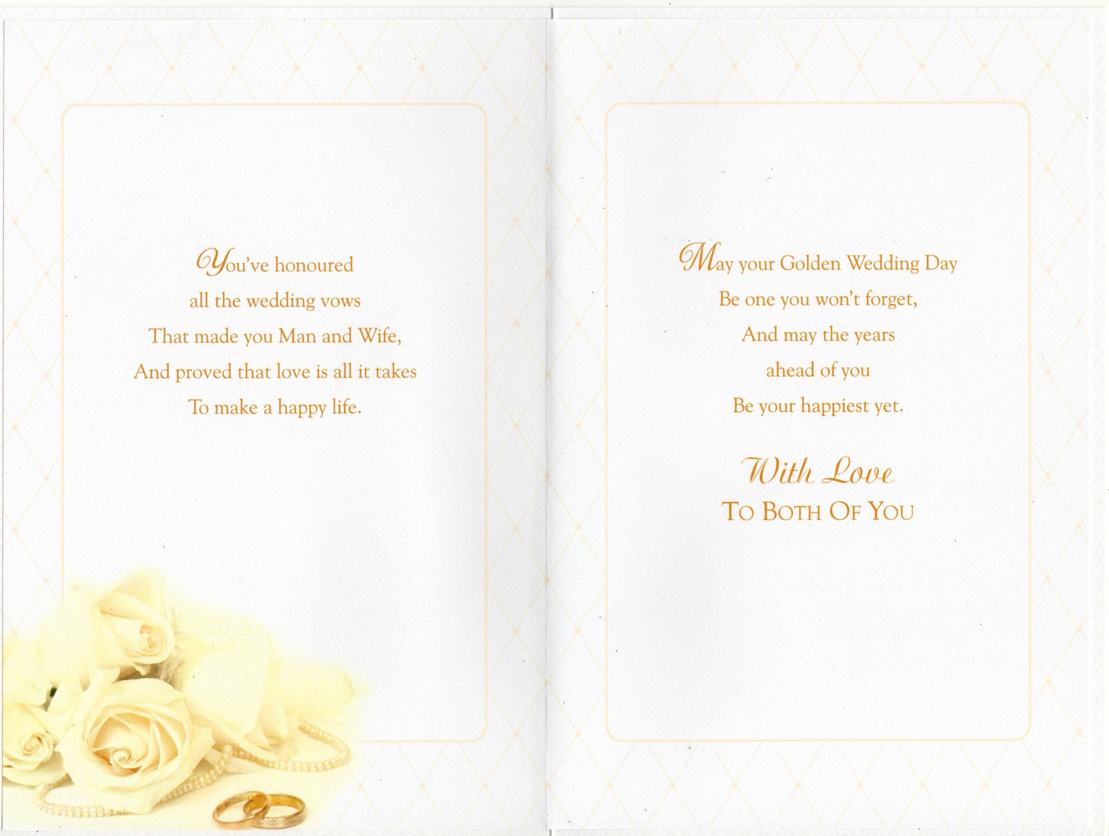 Inside reads: You've honoured all the wedding vows That made you Man and Wife, And proved that love is all it takes To make a happy life. May your Golden Wedding day Be one you Won't forget, And may the years ahead of you Be your happiest yet. With Love To Both of You.