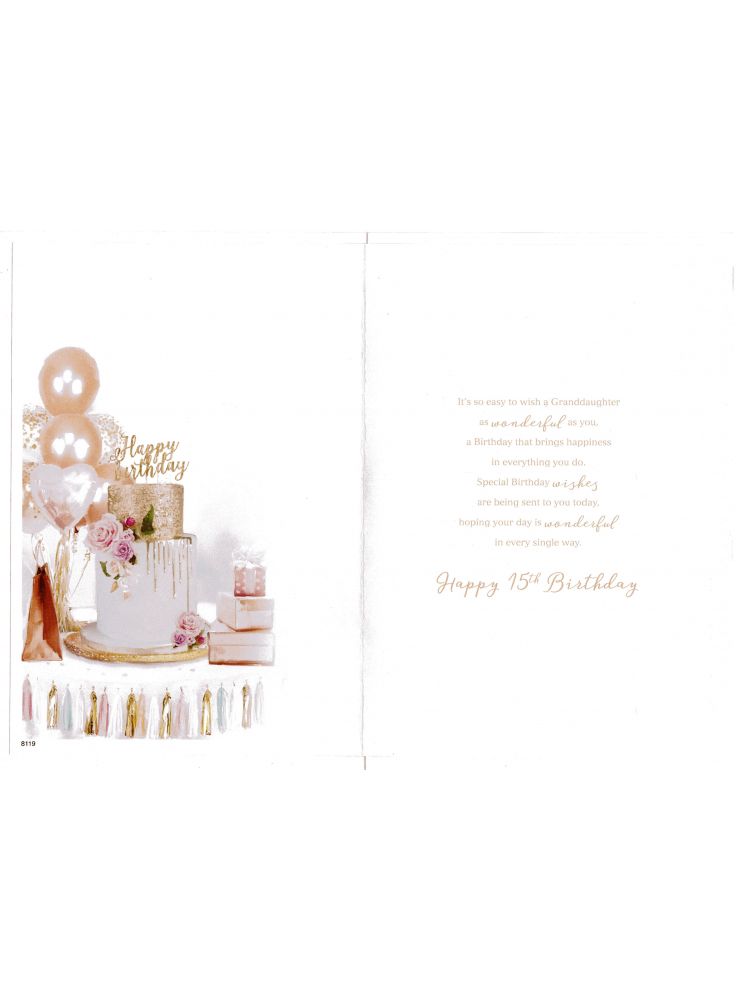 * Inside reads: It's so easy to wish a Granddaughter as wonderful as you, a Birthday that brings happiness in everything you do. Special Birthday wishes are being sent to you today, hoping your day is wonderful in every single day. Happy 15th Birthday