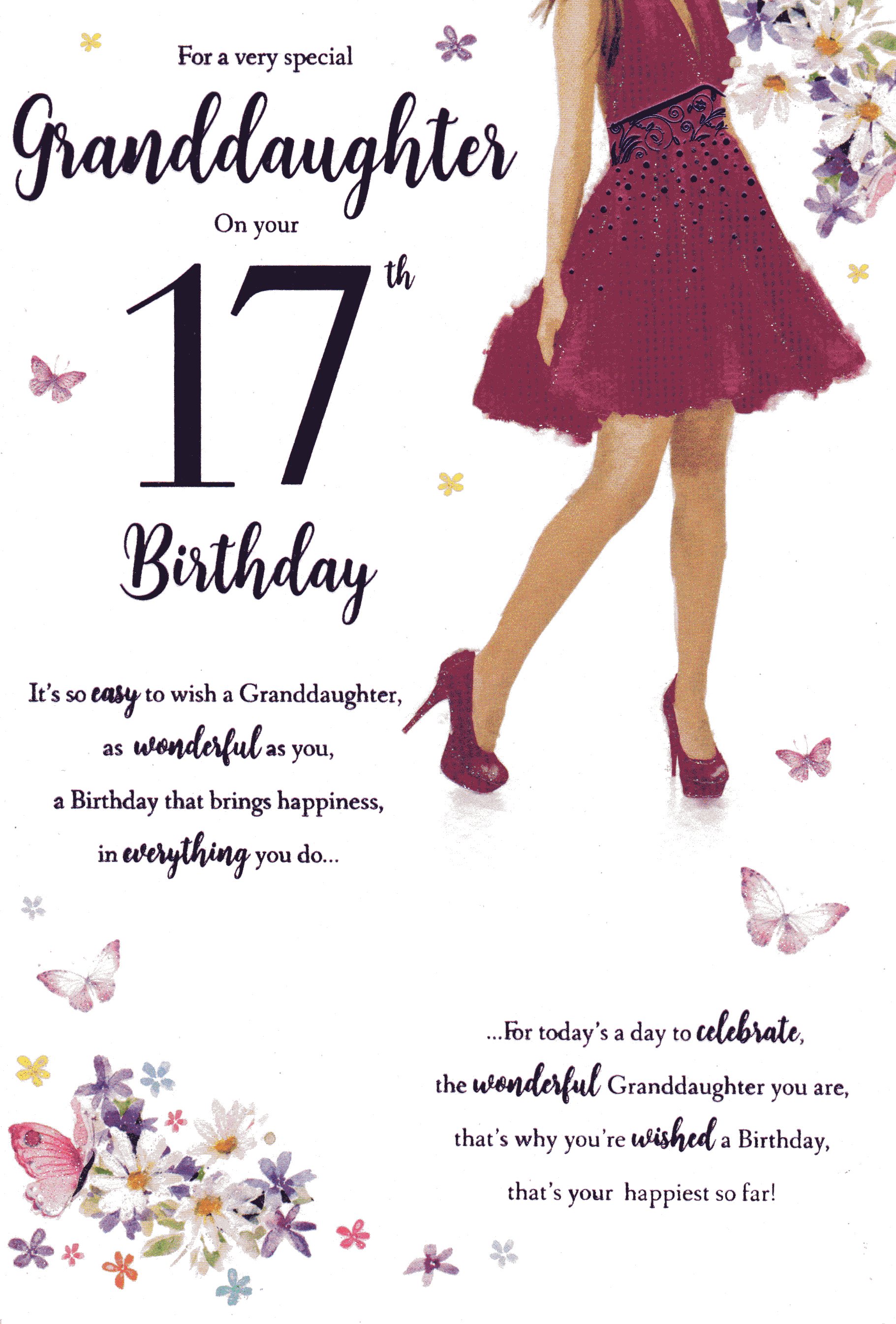 On the front the card reads: For A Very Special Granddaughter On Your 17th Birthday. It's so easy to wish a Granddaughter, as wonderful as you, a Birthday that bring happiness, in everything you do..., ... For today's a day to celebrate the wonderful granddaughter you are, that's why you're wished a Birthday, that's your happiest so far!