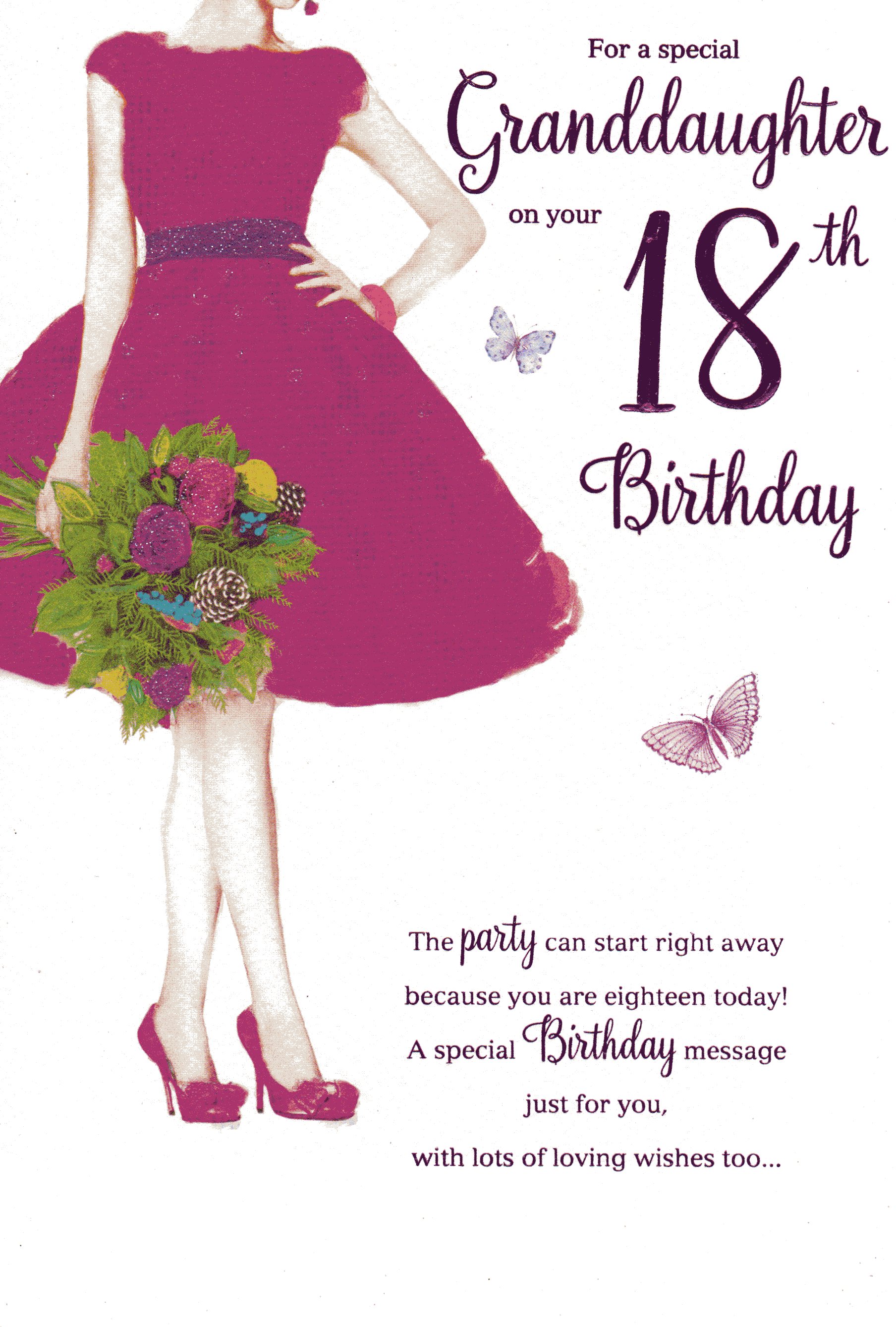 * On the front the card reads: For A Special Granddaughter On Your 18th Birthday. The party can start right away because you are eighteen today! A special Birthday message just for you, with lots of loving wishes too...