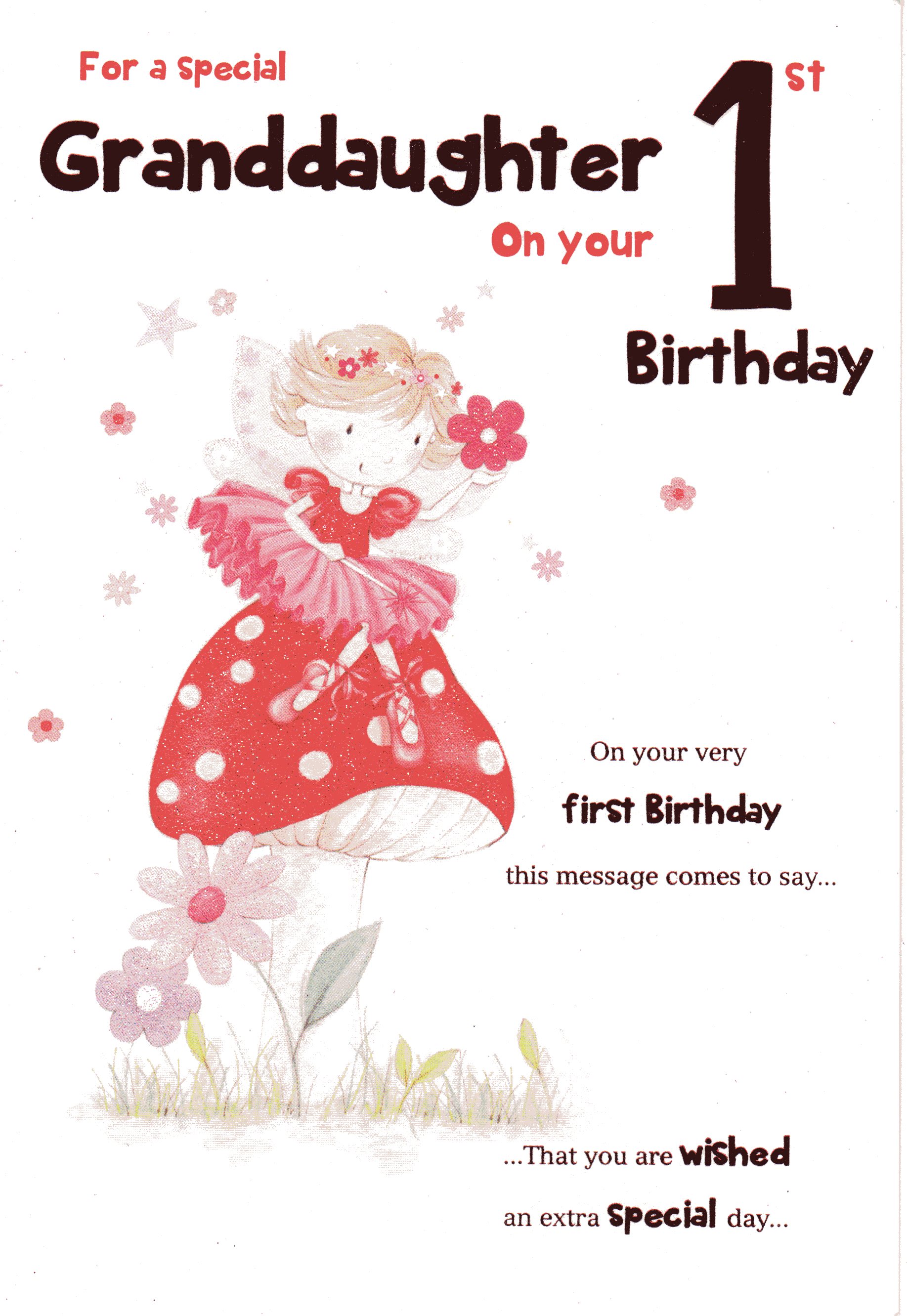 * On the front the card reads: For A Special Granddaughter On Your 1st Birthday. On Your very first Birthday this message comes to say..., ...That you are Wished an extra Special day...