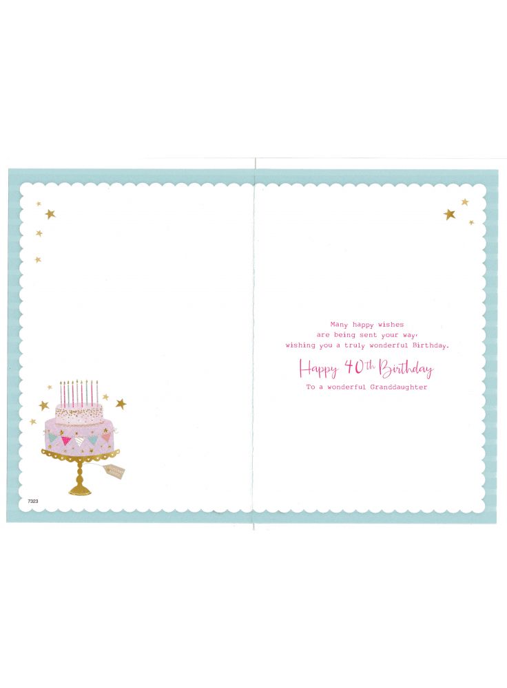 Inside reads: Many happy wishes are being sent your way, wishing you a truly wonderful Birthday. Happy 40th Birthday To a wonderful Granddaughter