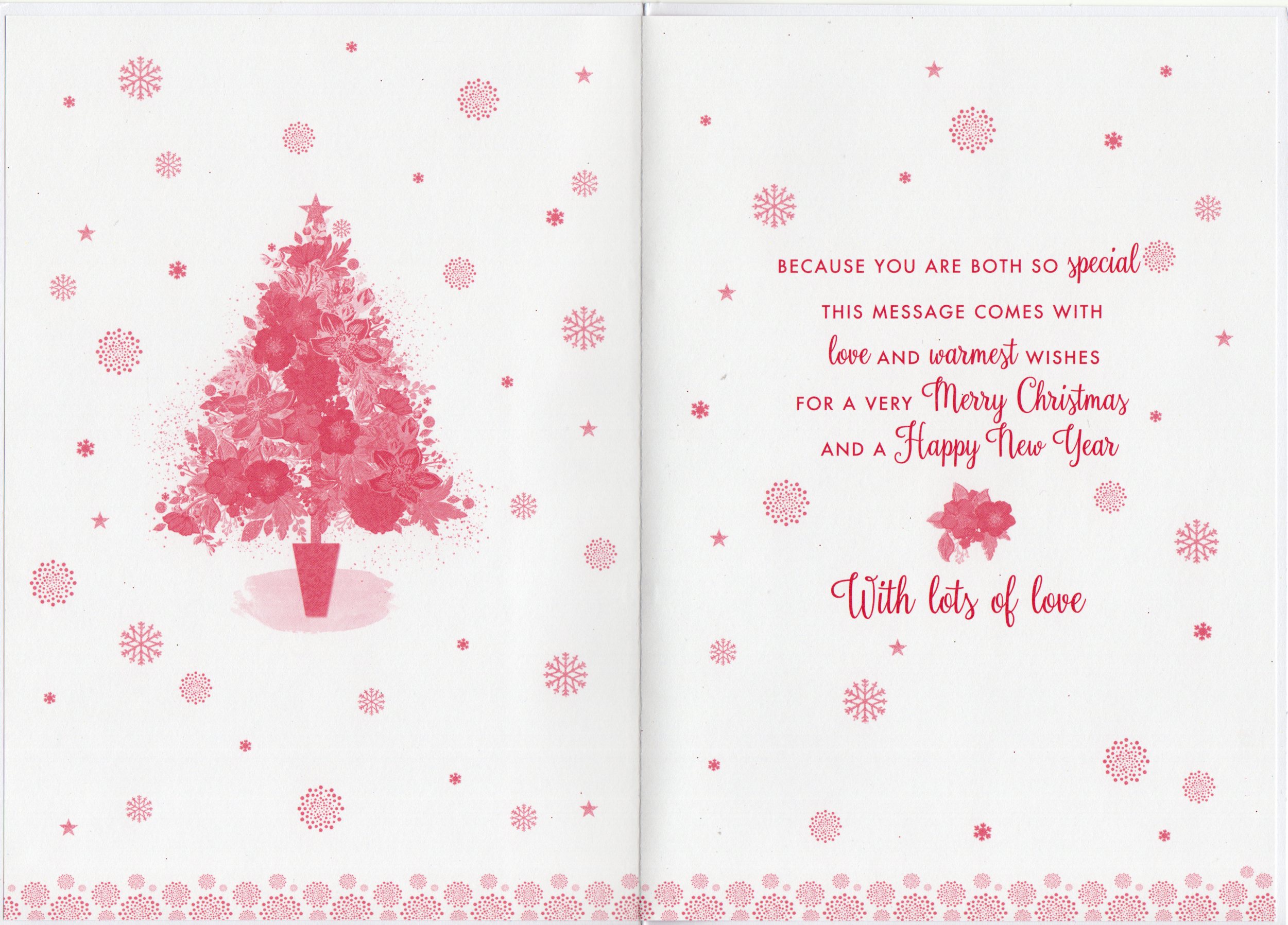 Inside reads: Because you are both so special this message come with love and warmest wishes for a very Merry Christmas and A Happy new Year with lots of love