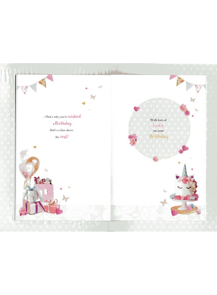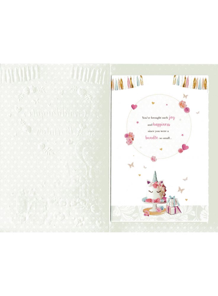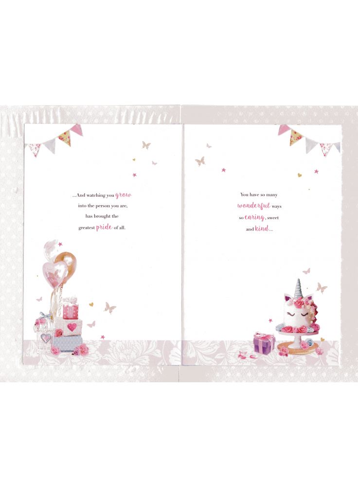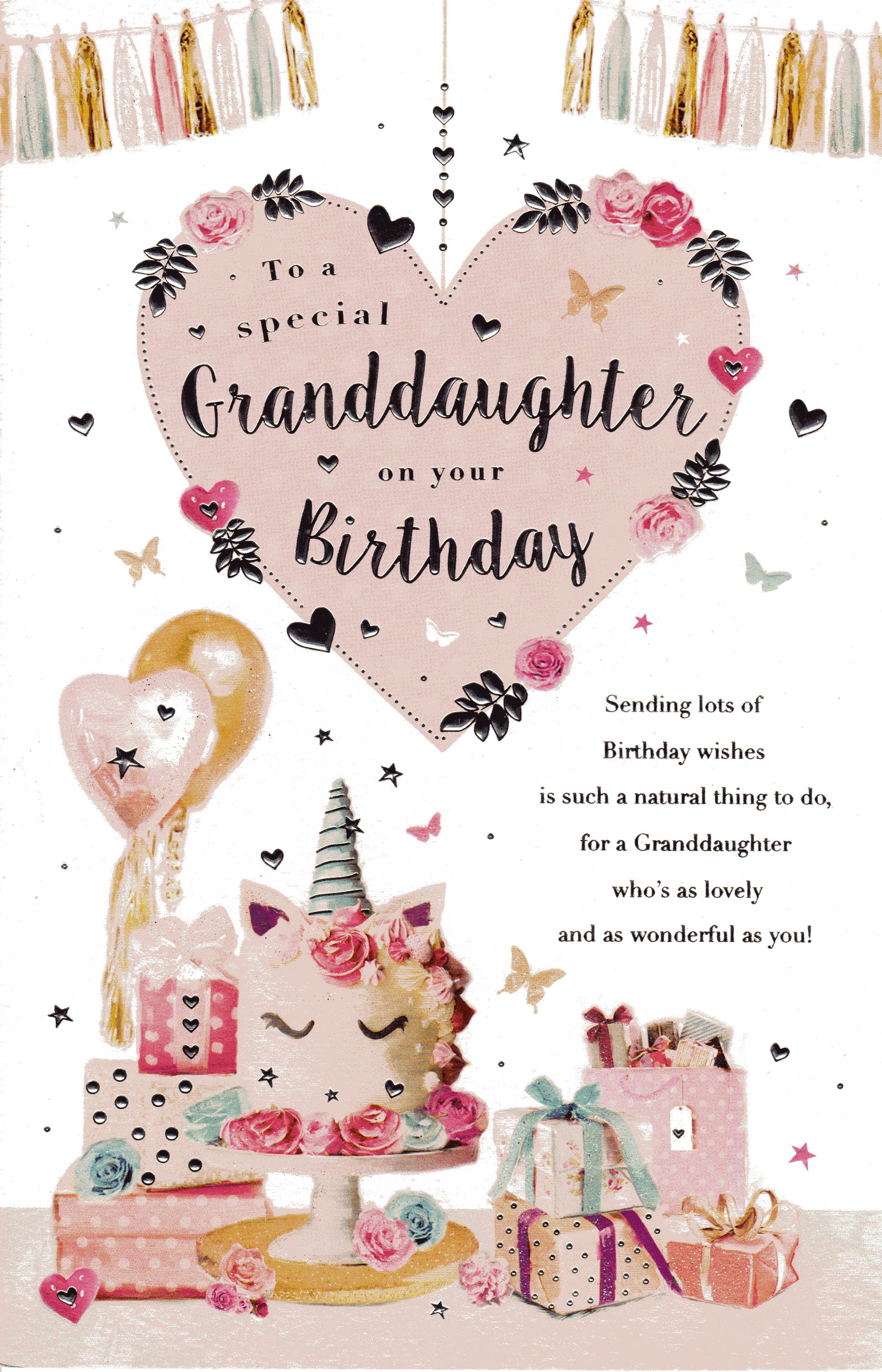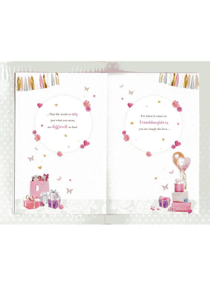 * On the front the card reads: To a Special Granddaughter on your Birthday. Sending lots of Birthday wishes is such a natural thing to do, for a Granddaughter who's as lovely and as wonderful as you!