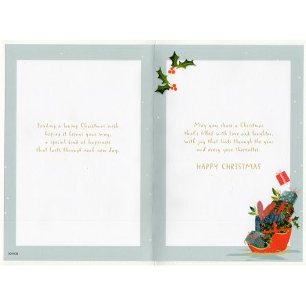 Inside reads: Sending a loving Christmas wish hoping it brings your way, a special kind of happiness that lasts through each new day. May you share a Christmas that's filled with love and laughter, with joy that lasts through the year and every year thereafter Happy Christmas