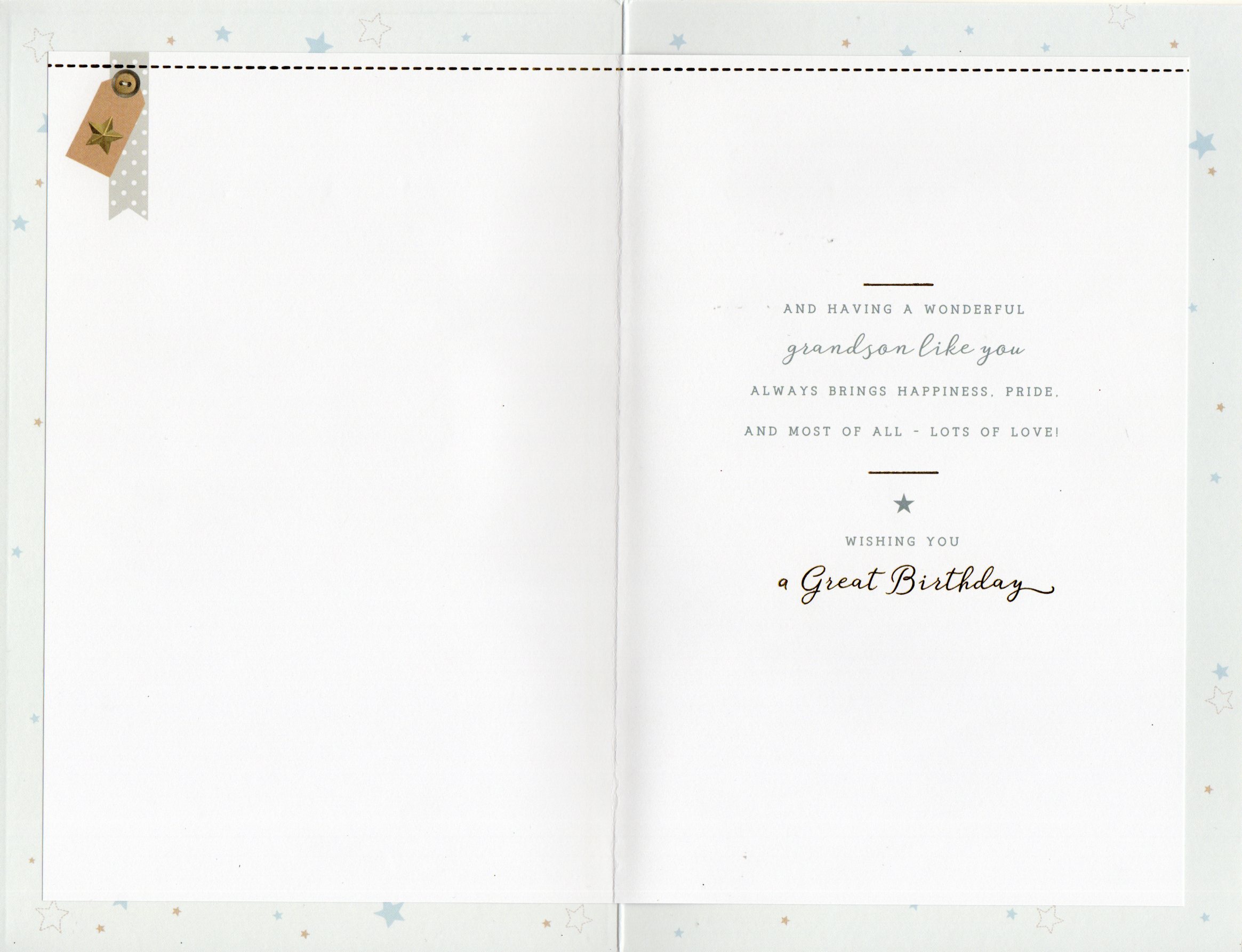 Inside reads: And having a wonderful grandson like you always brings happiness, pride, and most of all - Lots Of Love! wishing you a Great Birthday