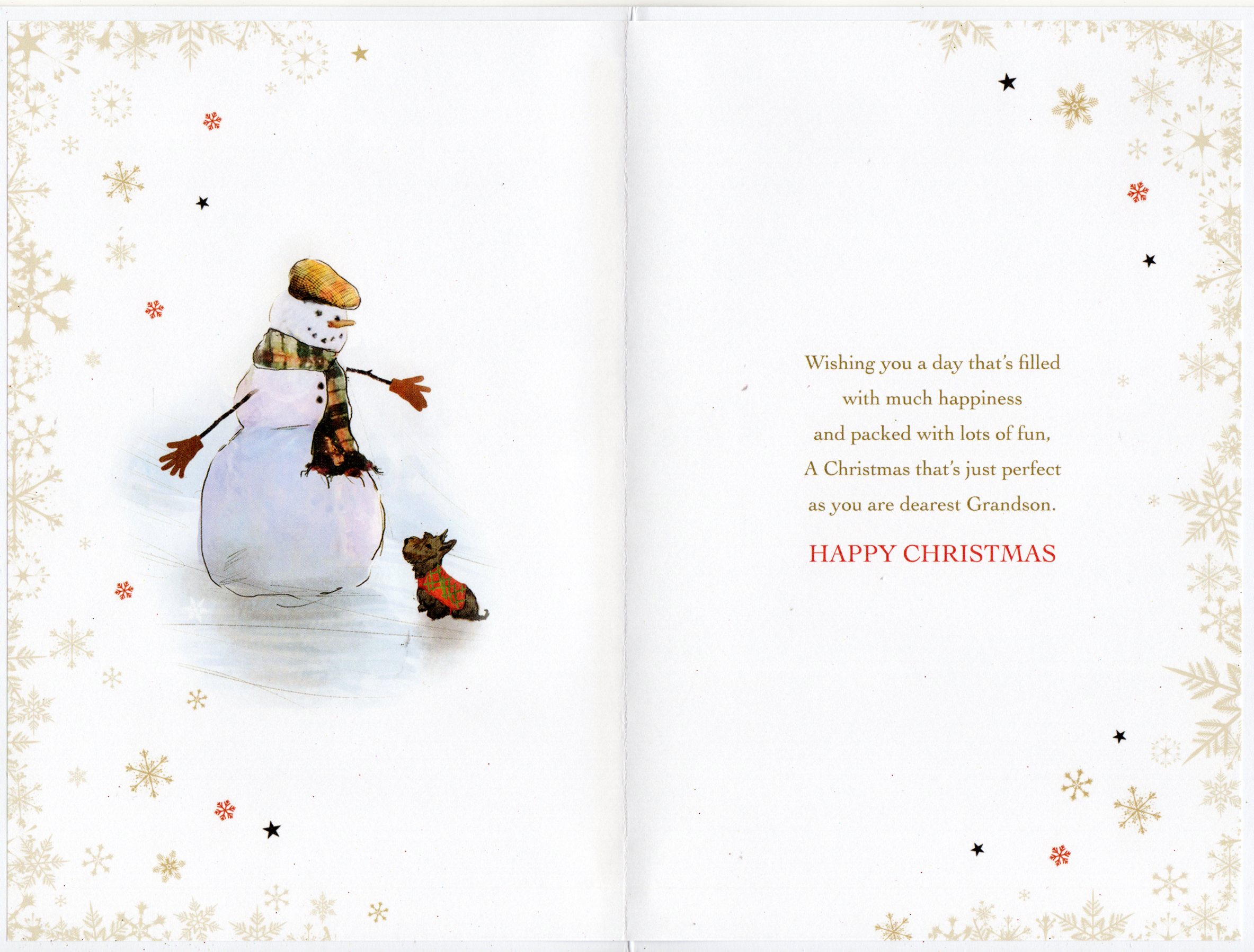 Inside reads: Wishing you a day that's filled with much happiness and packed with lots of fun, A Christmas that's just perfect as you are dearest Grandson. Happy Christmas