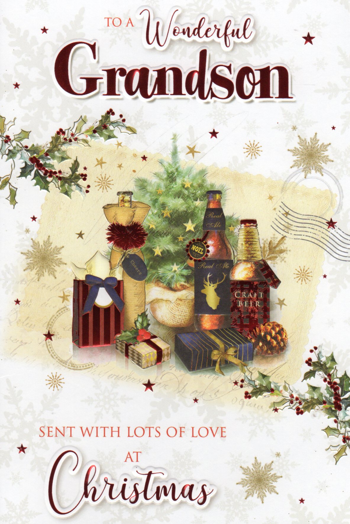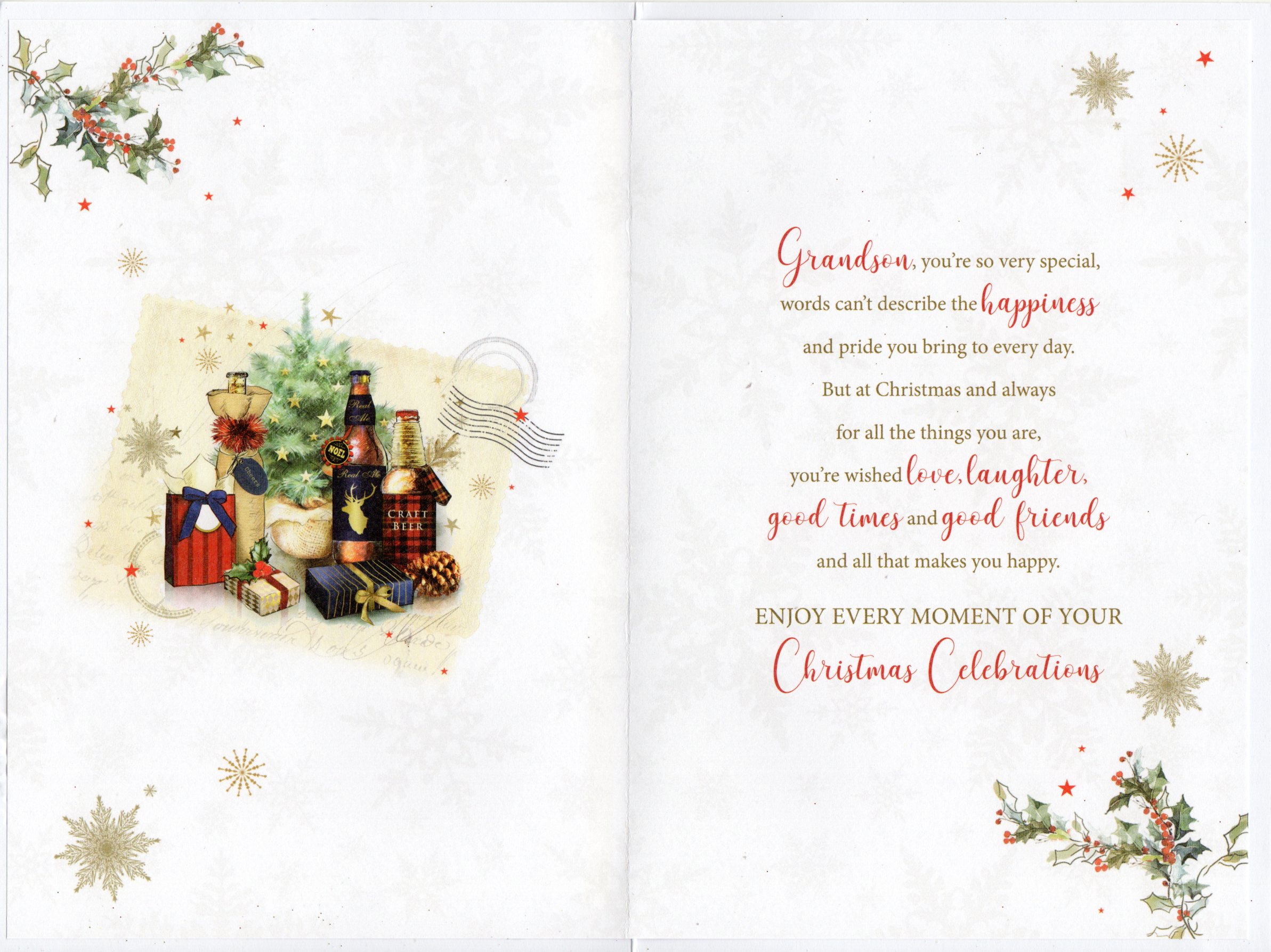 Inside reads: Grandson, you're so very special, words can't describe the happiness and pride you bring to every day. But at Christmas and always for all the things you are, you're wished love, laughter, good time and good friends and all that make you happy. Enjoy Every Moment Of Your Christmas Celebrations