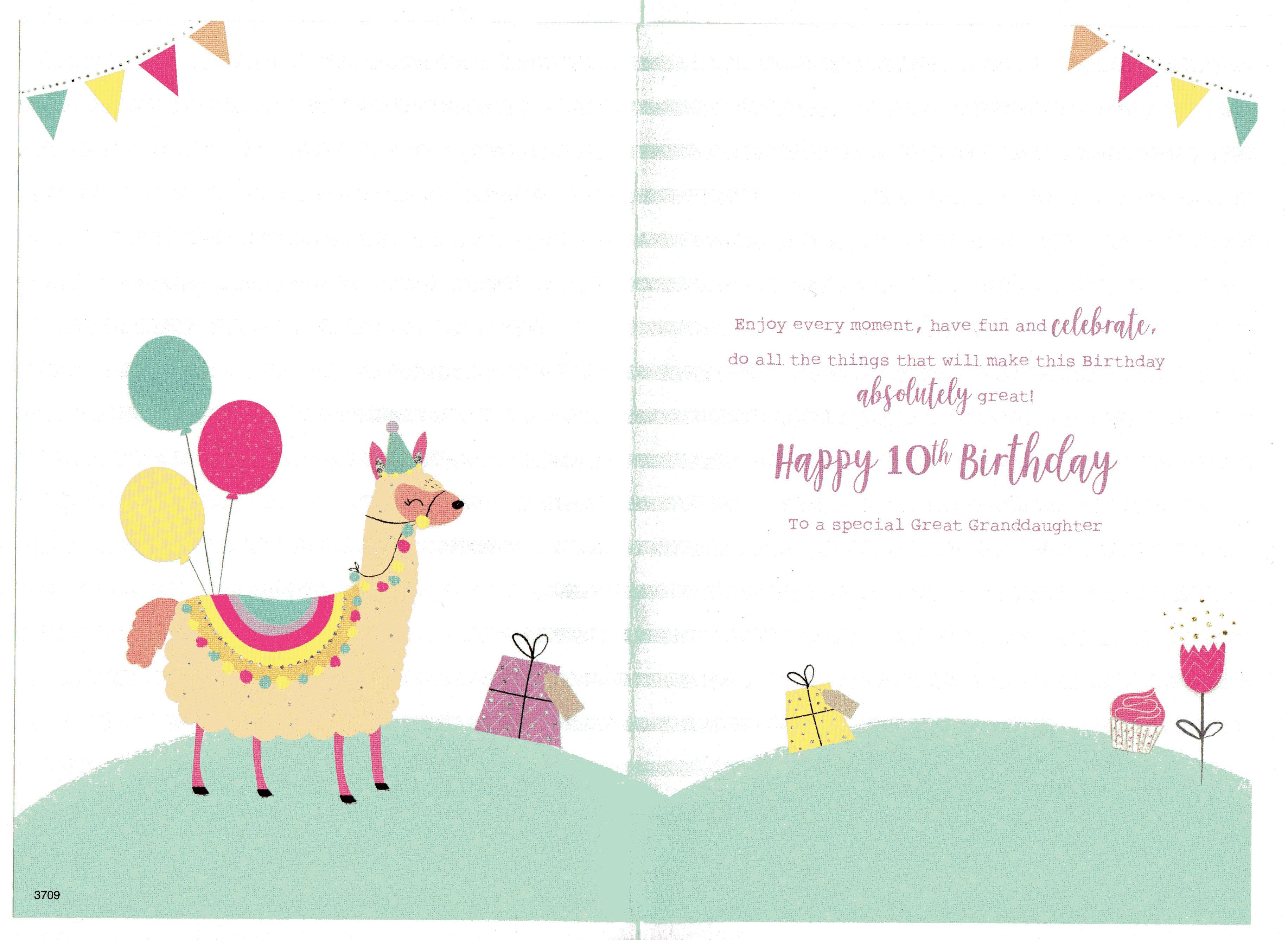 Inside reads: Enjoy every moment, have fun and celebrate, do all the things that will make this Birthday absolutely great! Happy 10th Birthday To a special Great Granddaughter