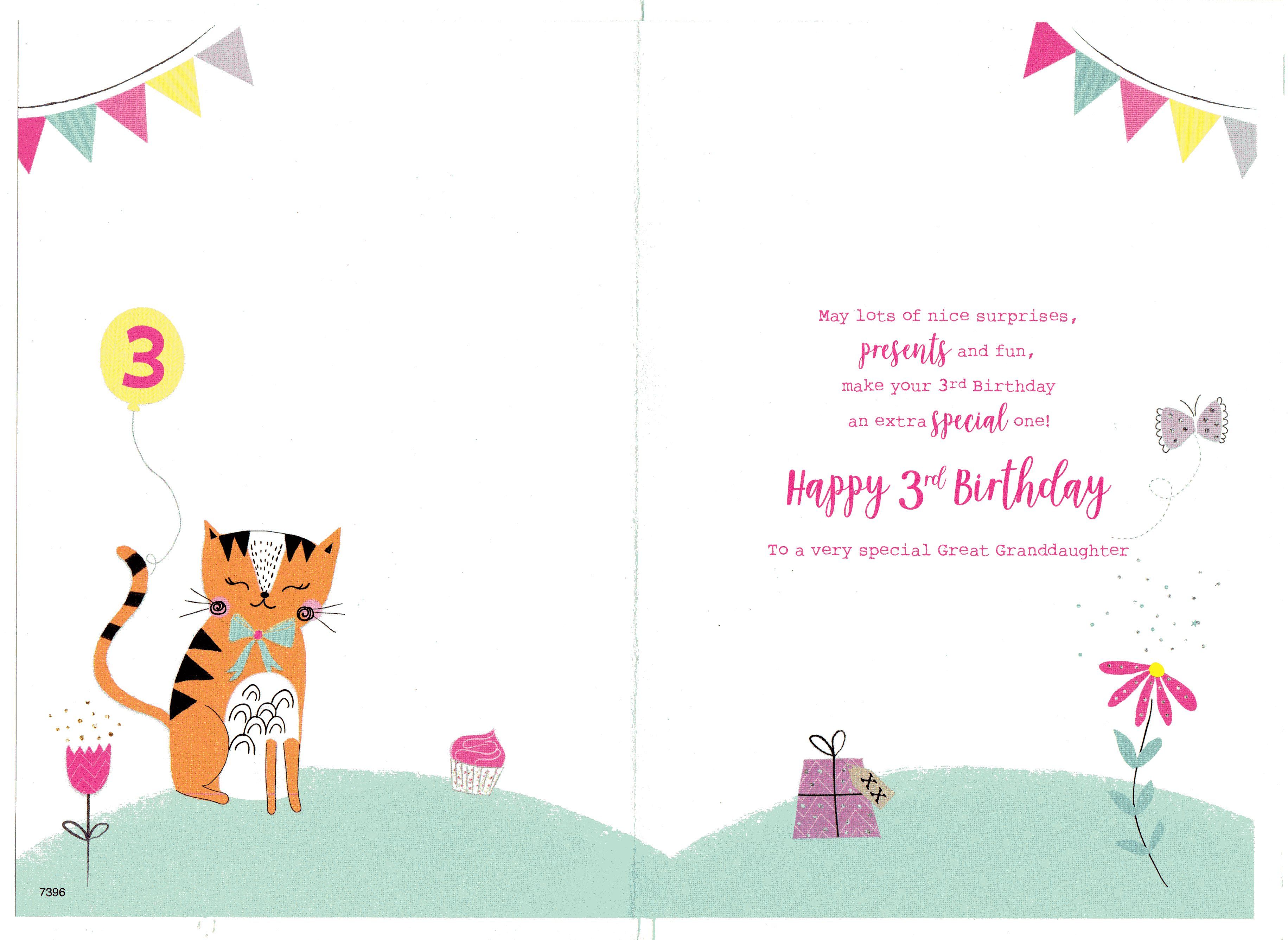 Inside reads: May lots of nice surprises, Presents and fun, make your 3rd Birthday an extra special one! Happy 3rd Birthday To a very special Great Granddaughter.