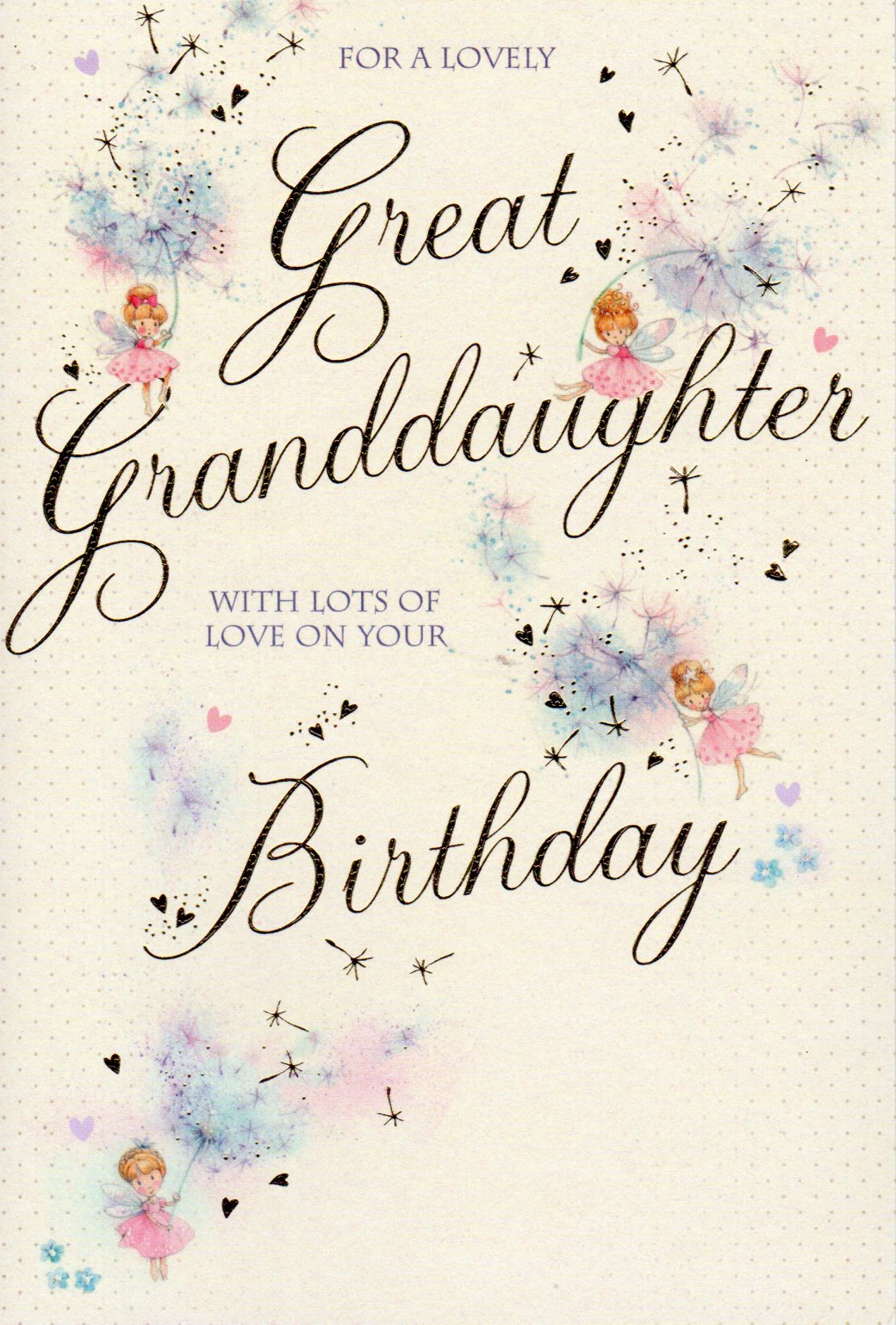 Inside reads: Great-Granddaughter, you're delightful in so many different ways, you fill the world with sunshine and add joy to many days. So hope your birthday's bright with laughter, joy and fun, the best celebration ever, in fact your very favourite one! Birthday Wishes With Love Great-Granddaughter