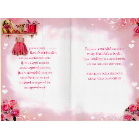 Inside reads: You're lovely Great-Granddaughter and now your birthday's due, Here is a sweet reminder of what is special about you, You're a beautiful young lady who is loved so very much, It's hoped your special day, has a special touch, For you're wonderful and you're caring, beautiful and bright, Here's wishing you a happy birthday one that turns out exactly right. With Love For A Precious Great-Granddaughter