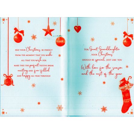 Inside reads: May Your Christmas Be Perfect From The Moment That You Wake All That You Wish For Make This The Perfect Festive Break Exciting And Fun - Filled And Happy All ear Through, For Great Granddaughter Your Christmas Should Be Special, Just Like You With Love For The Season And The Rest Of The Year