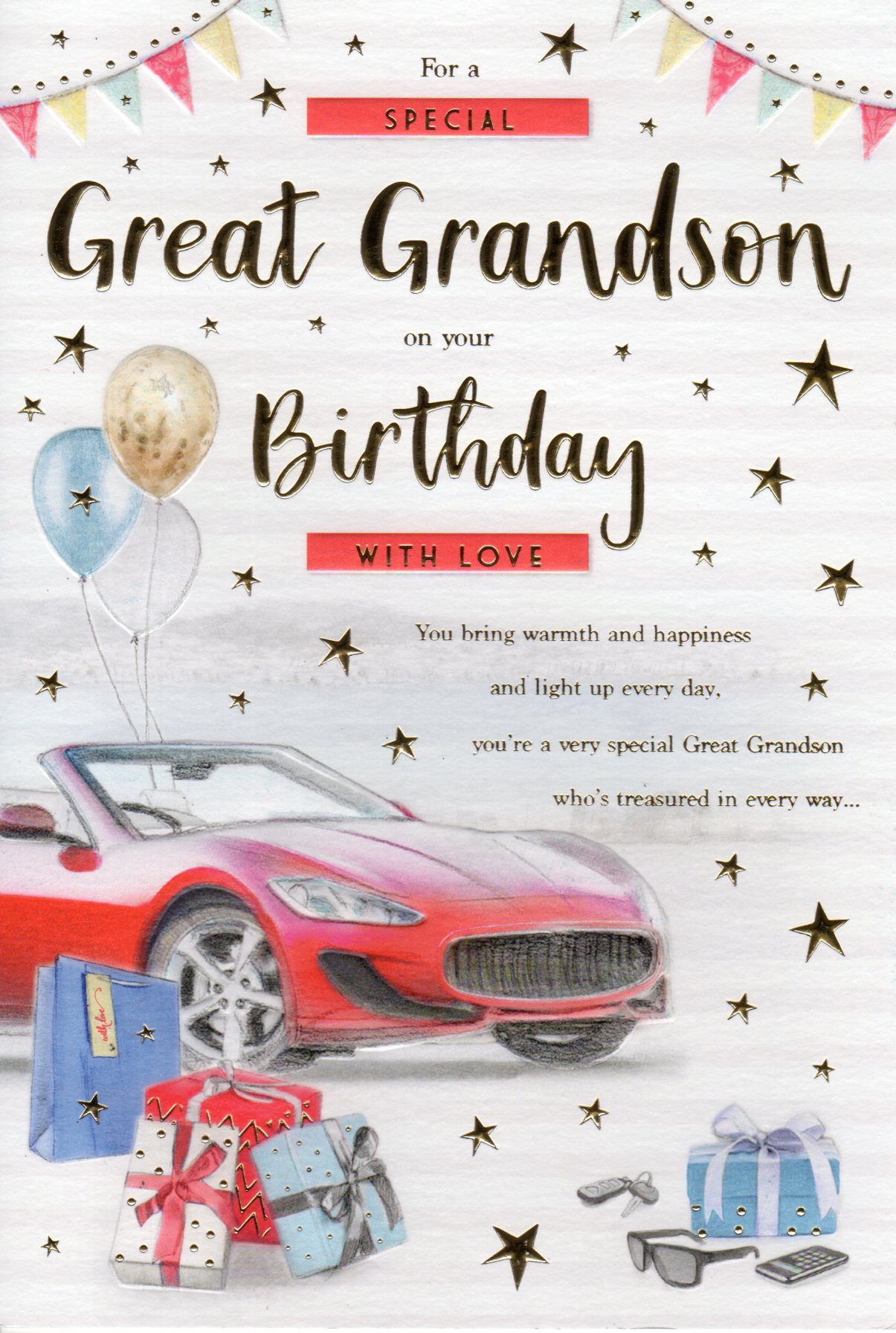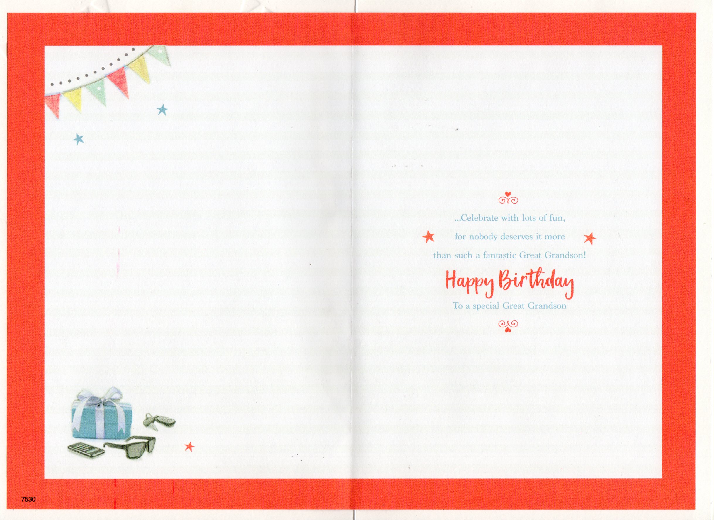 Inside reads: ...Celebrate with lots of fun, for nobody deserves it more than such a fantastic Great Grandson! Happy Birthday To a special Great Grandson