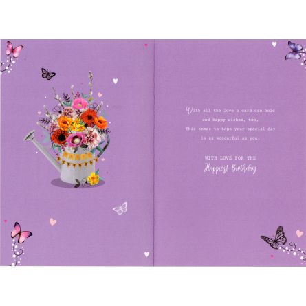 Inside reads: With all the love a card can hold and happy wishes, too, this comes to hope your special day is as wonderful as you. With Love For The Happiest Birthday